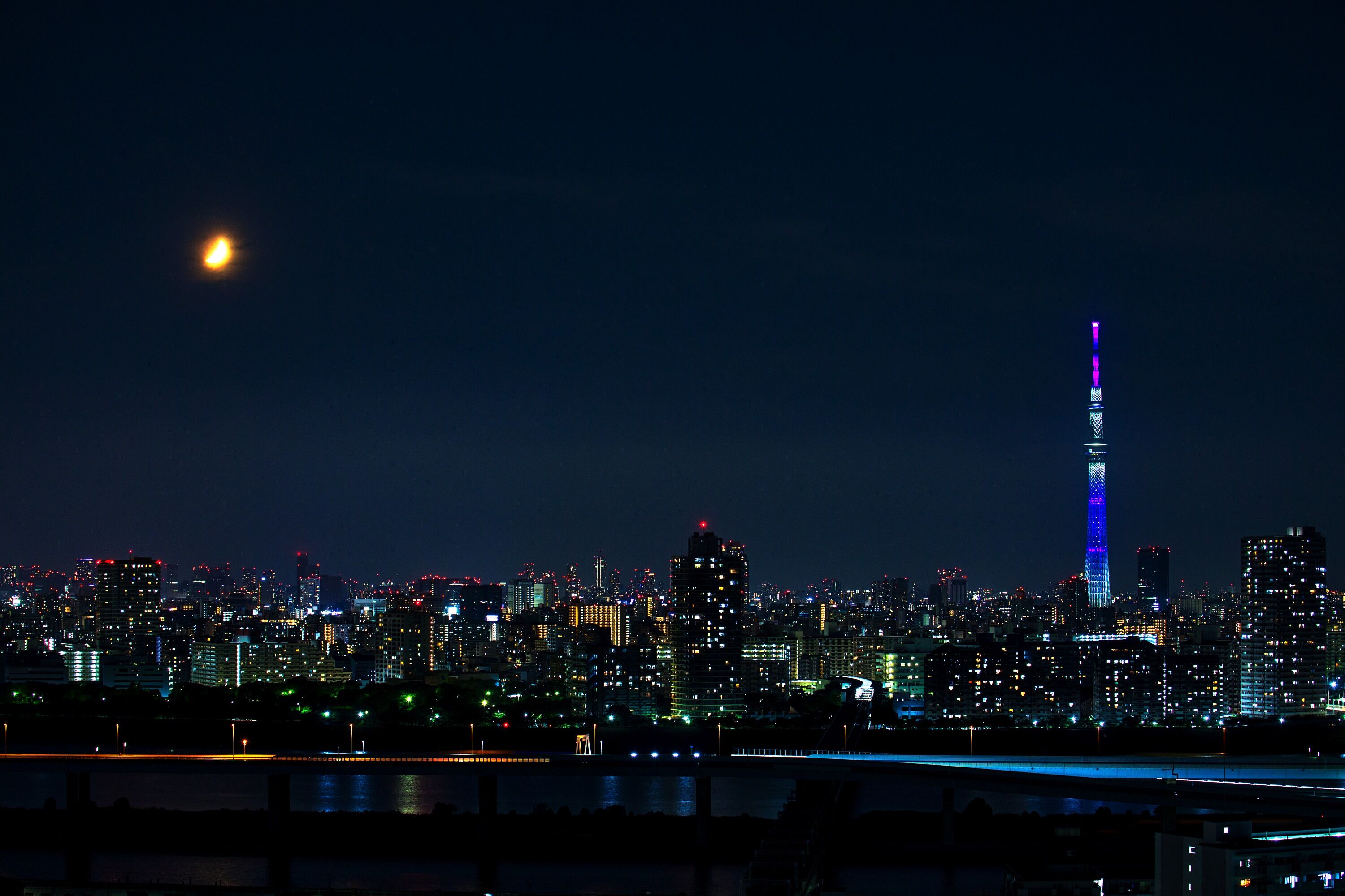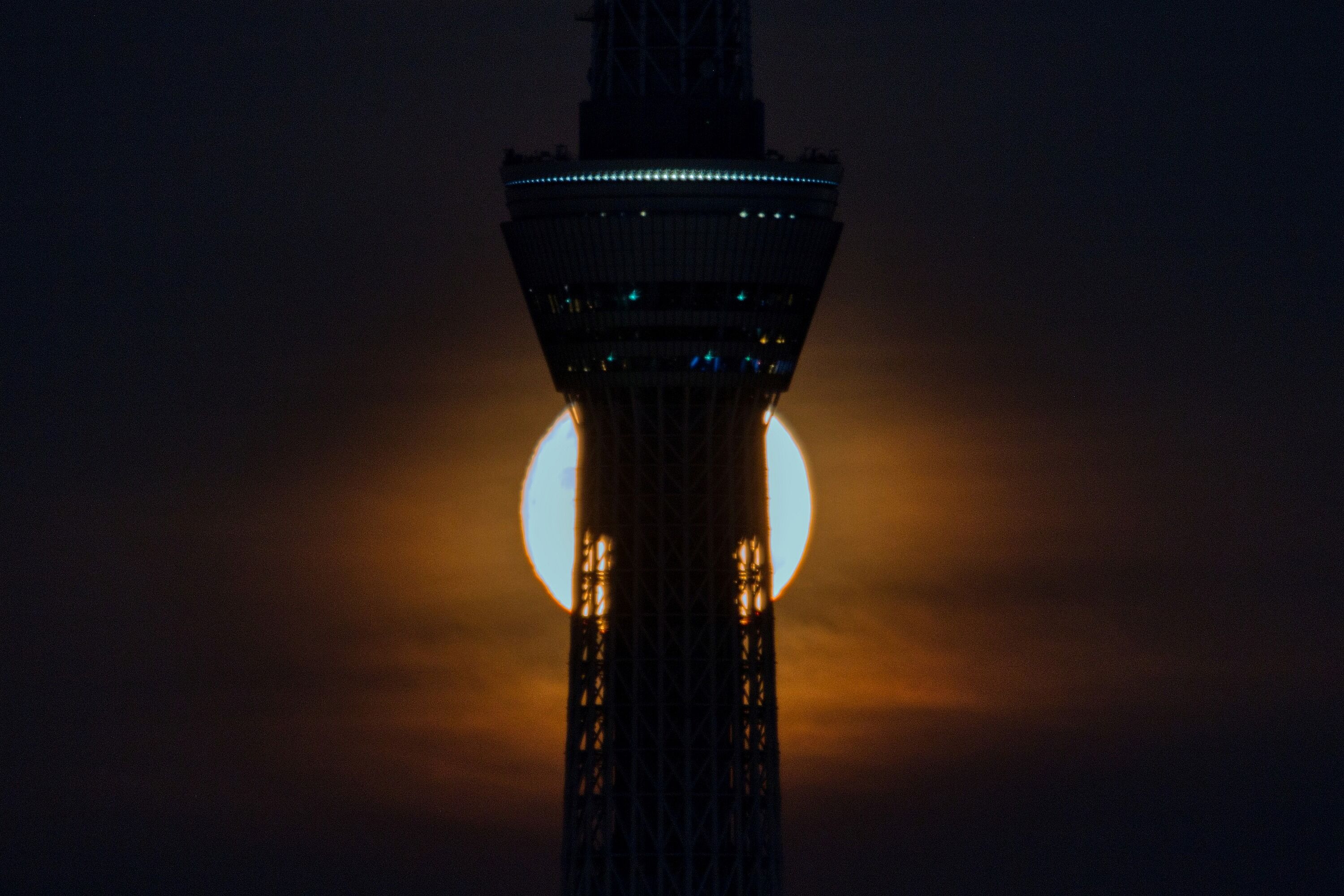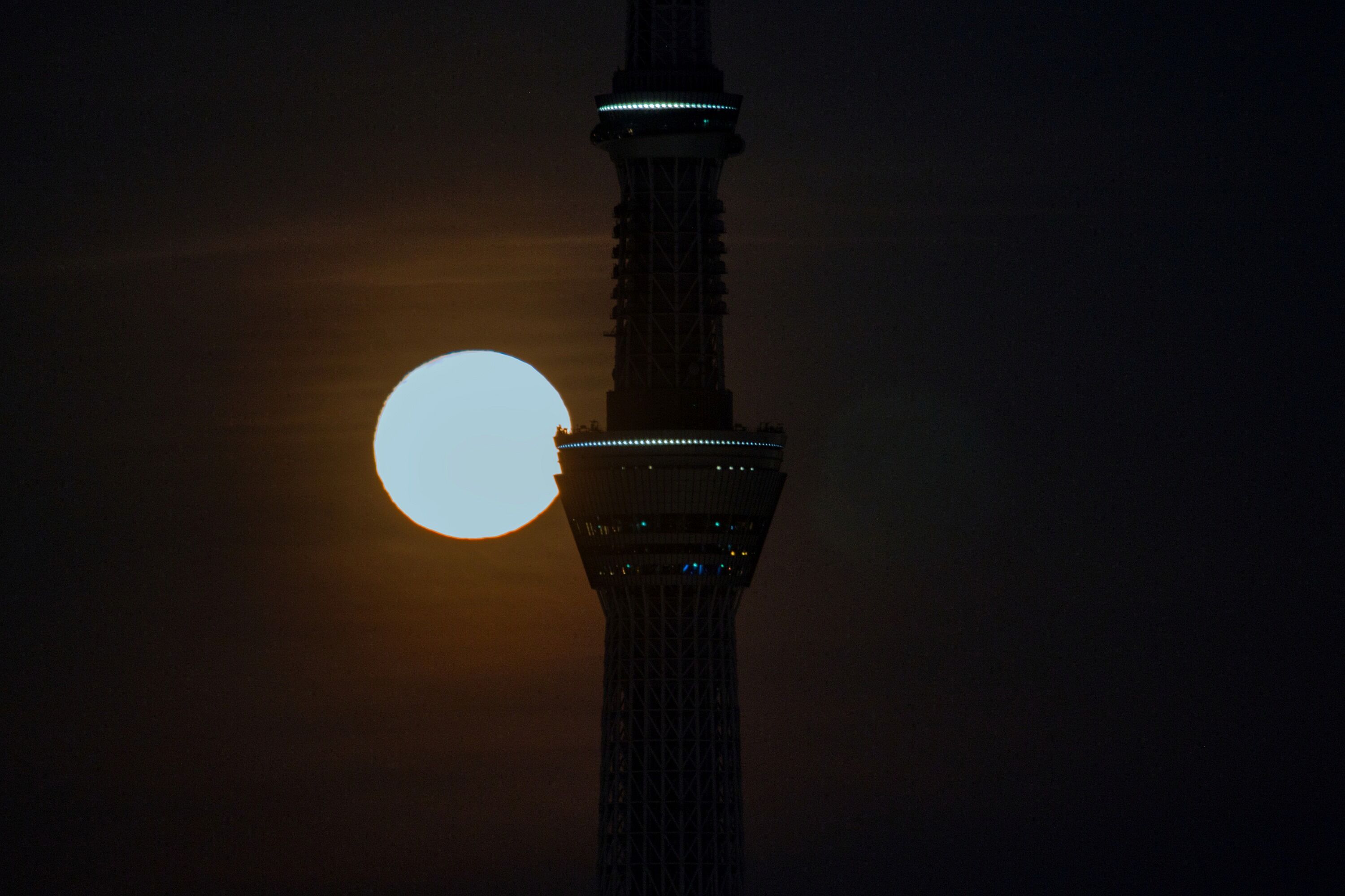 本当は月とスカイツリーが同じ高さに並んだときに撮りたかったのですが、同ライティングは22時までだったので無理でした。この縦構図は21時59分の撮影です。