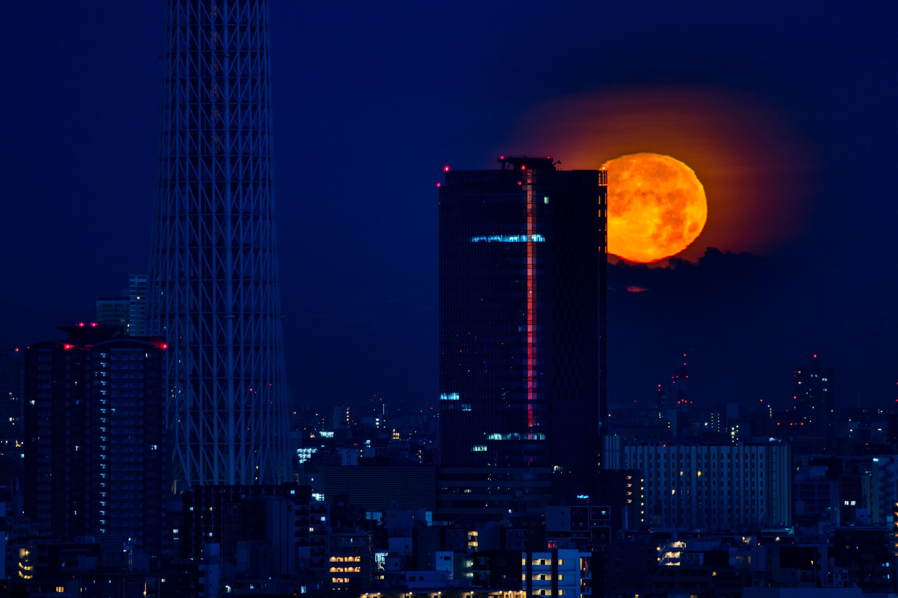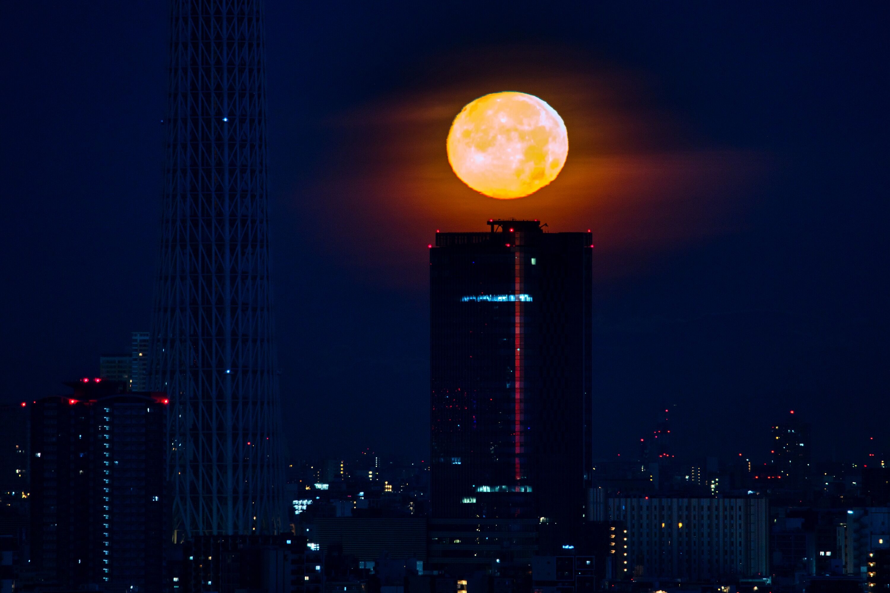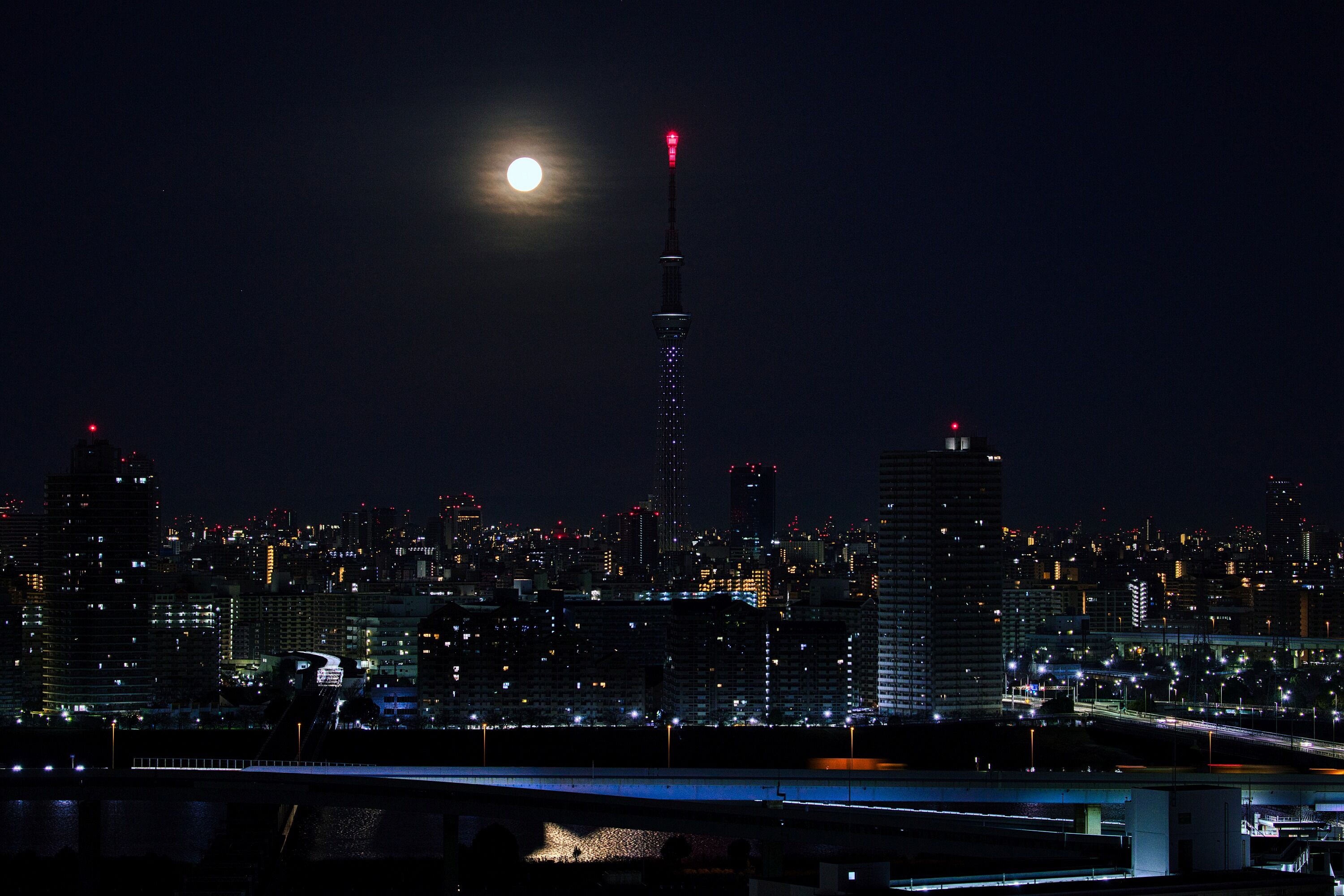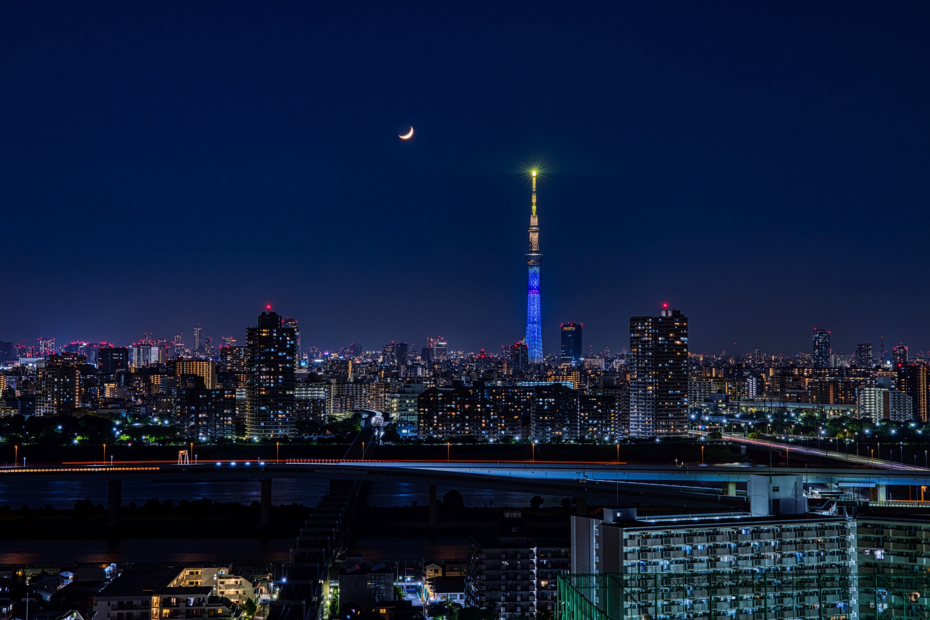本当は月とスカイツリーが同じ高さに並んだときに撮りたかったのですが、同ライティングは22時までだったので無理でした。この縦構図は21時59分の撮影です。