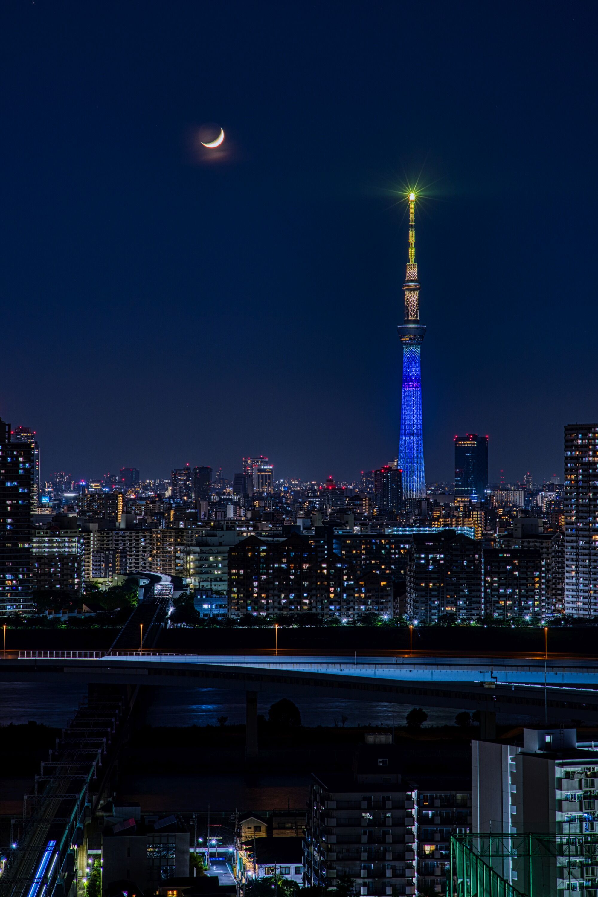 2022年5月5日、自宅マンションから撮影した月と東京スカイツリーです。この日のライトアップは東京スカイツリータウン開業10周年を記念して、東京スカイツリー公式キャラクターソラカラちゃんをイメージした特別ライティング「ソラカラちゃんライティング」でした。