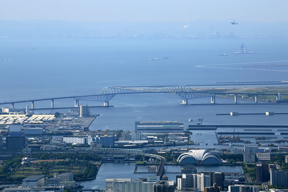 「東京ゲートブリッジ」にズームです。今回の写真は全部手持ち撮影なので画質はそれほど良くありません。ちょっとわかりにくいですが東京ゲートブリッジの下の方にドームを重ねたような建物があるのですが、これが「辰巳国際水泳場」です。