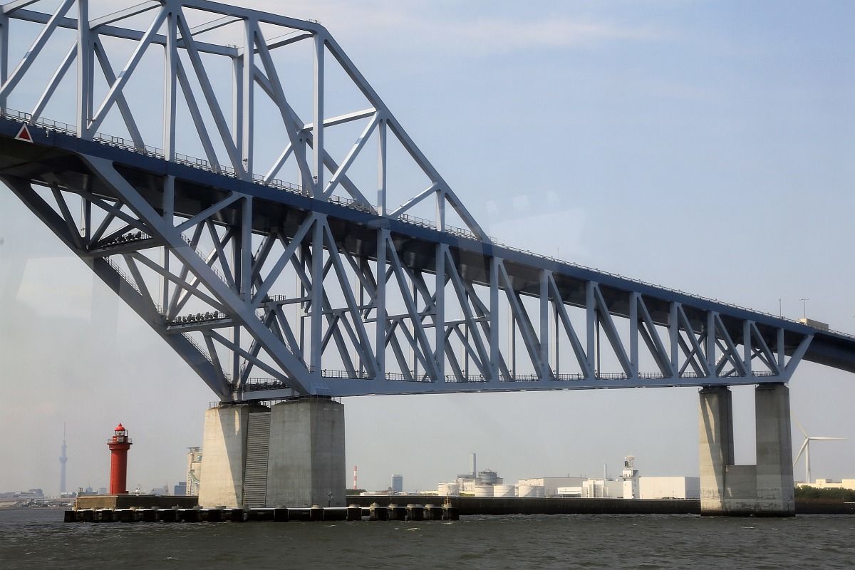 自分が座った右側の座席からだと、このように「東京ゲートブリッジ」を潜るちょっと前になんとか撮れる程度でした。左端の灯台と同じ高さにちょこんと見えるのがスカイツリーです(^^;)