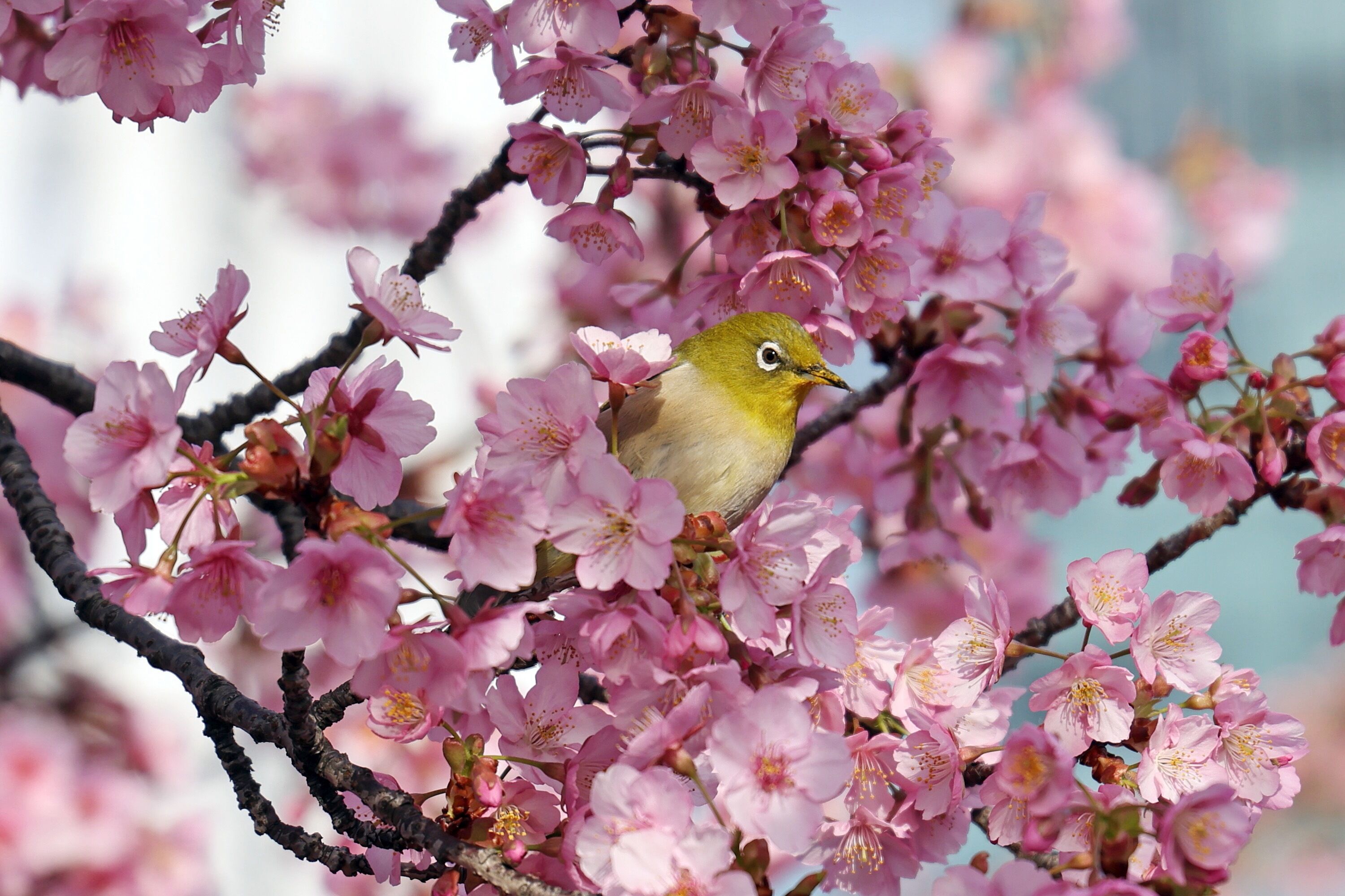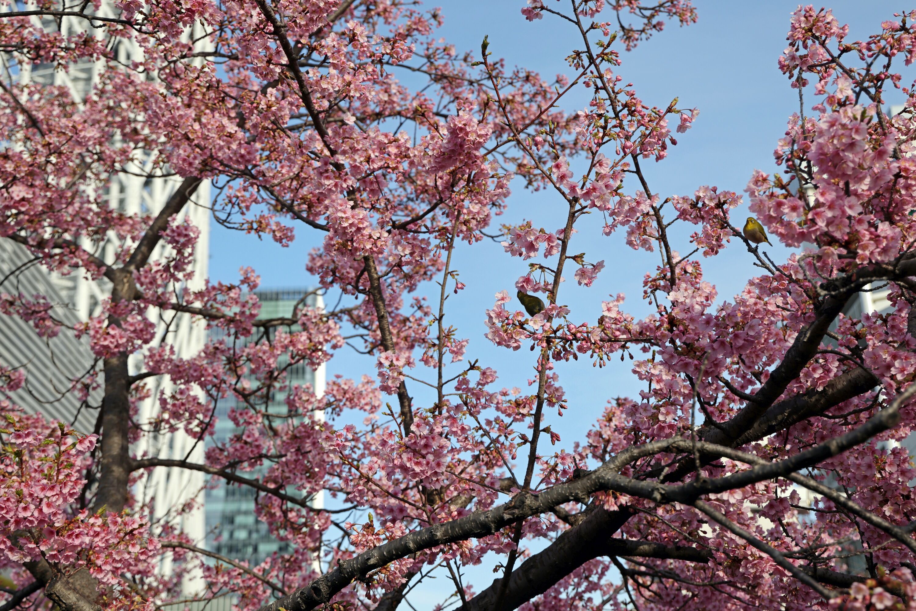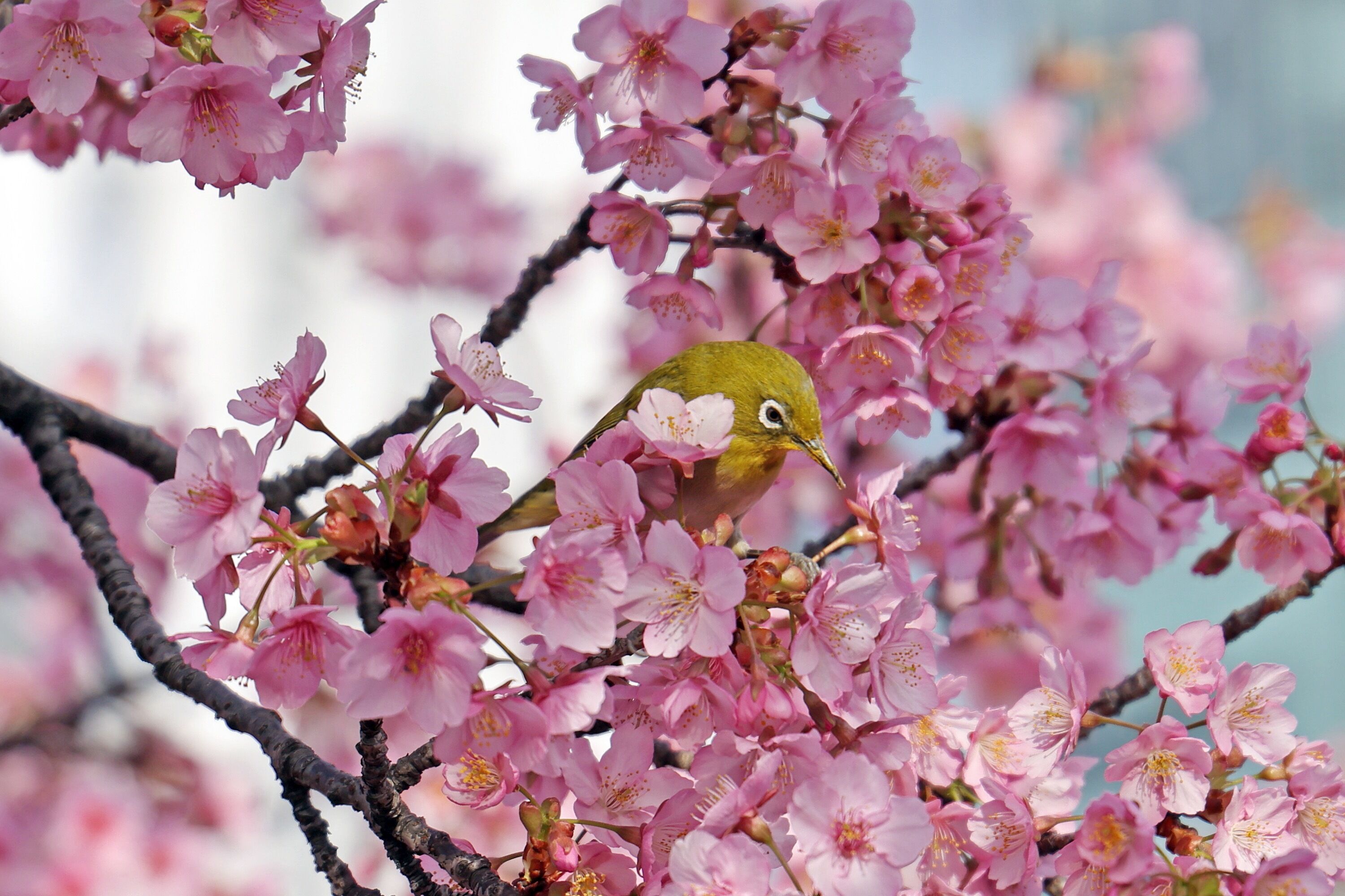 メジロにズームです。背景がボケていて全然わかりませんが、一応スカイツリーバックで撮っています。