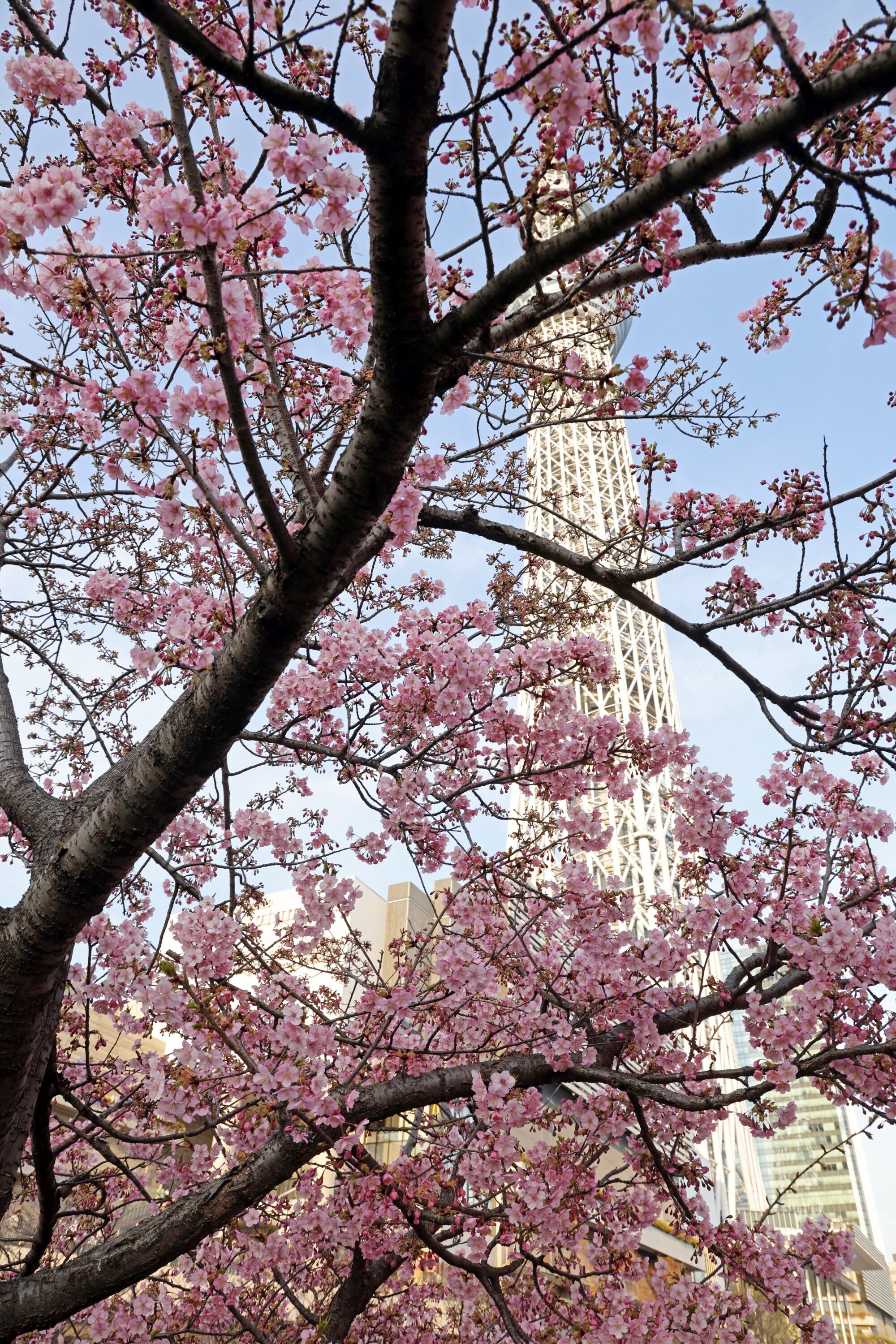 2024年2月24日に撮影した東武橋のところにある河津桜と東京スカイツリーです。3連休の唯一の天気が良い日ということもあって大勢の人で賑わっていました。