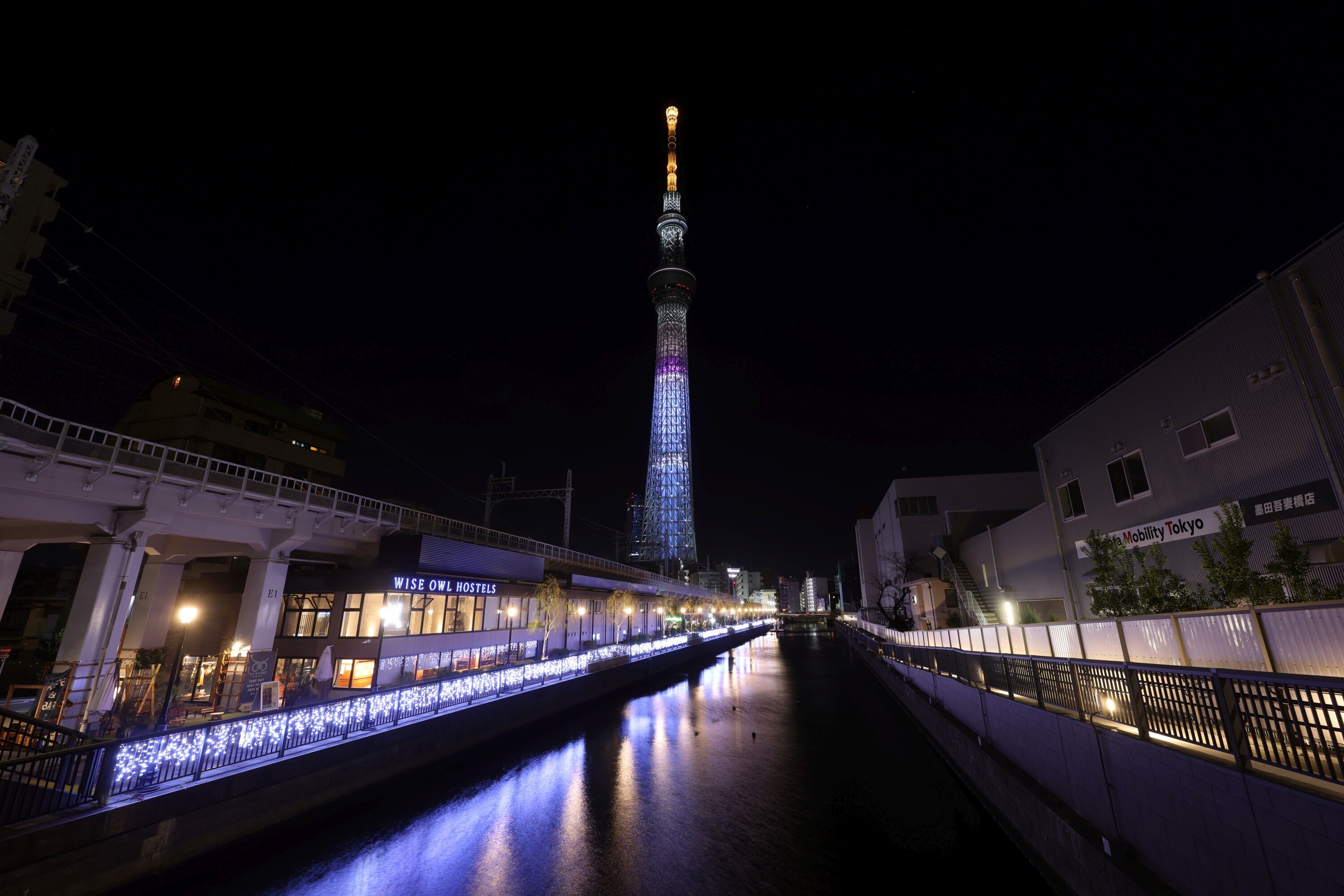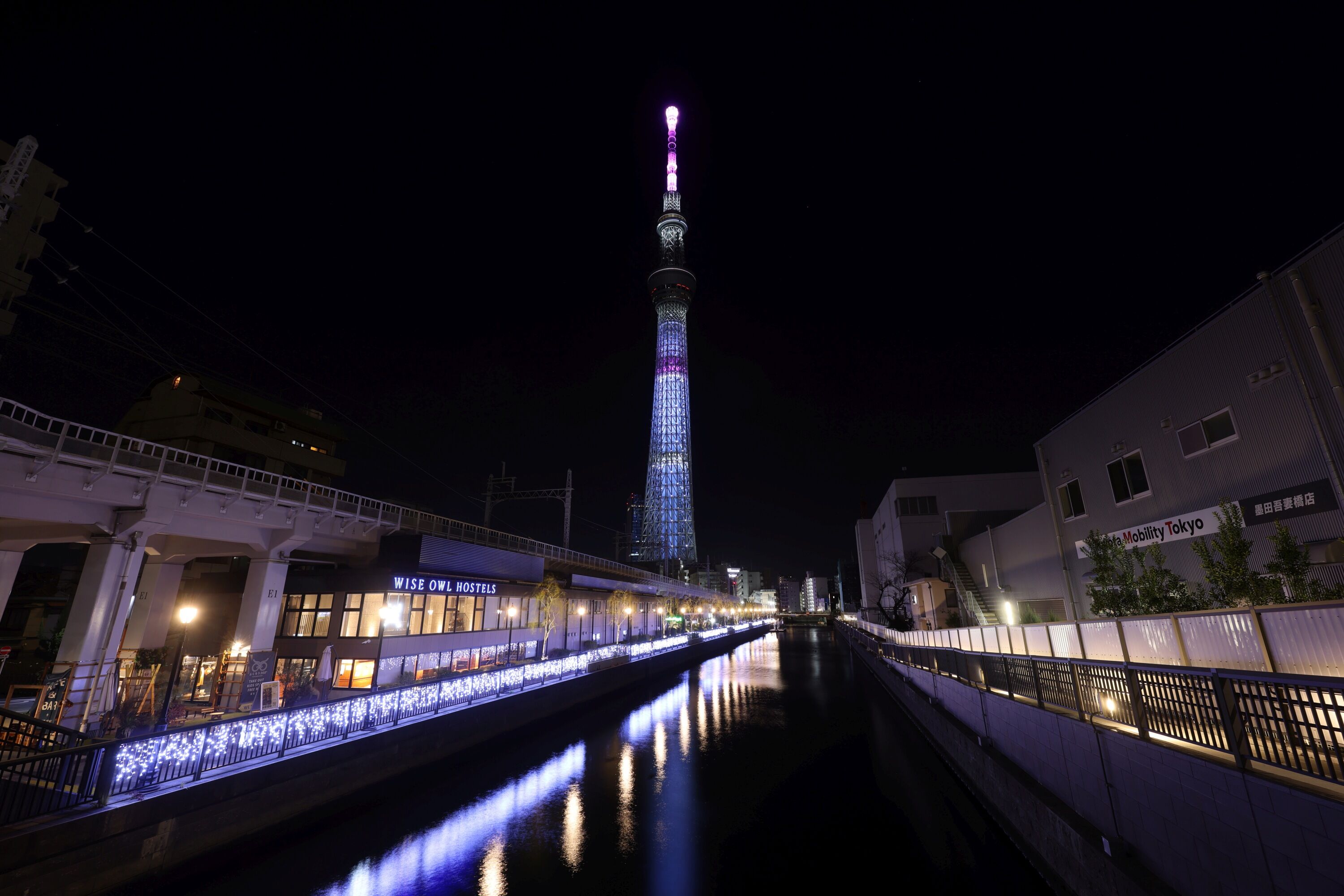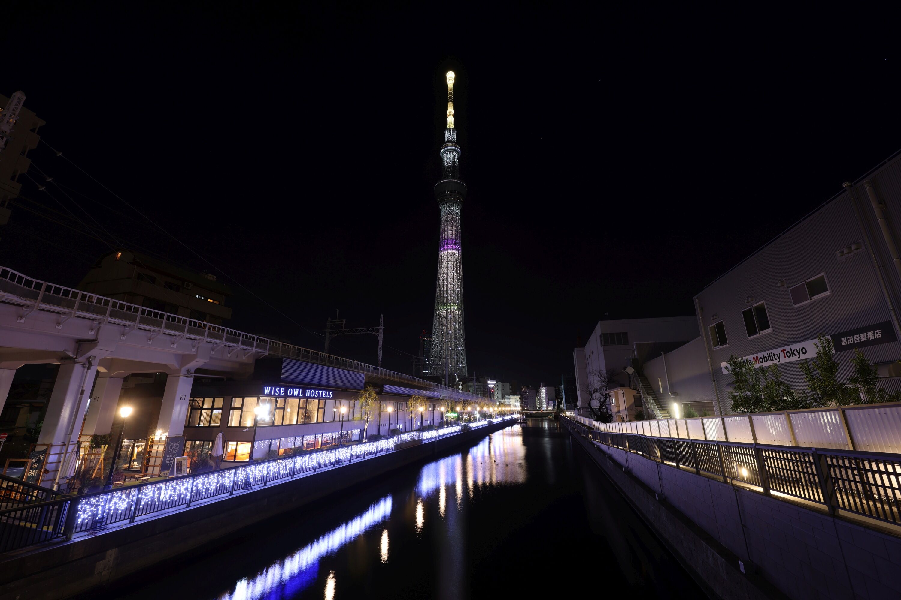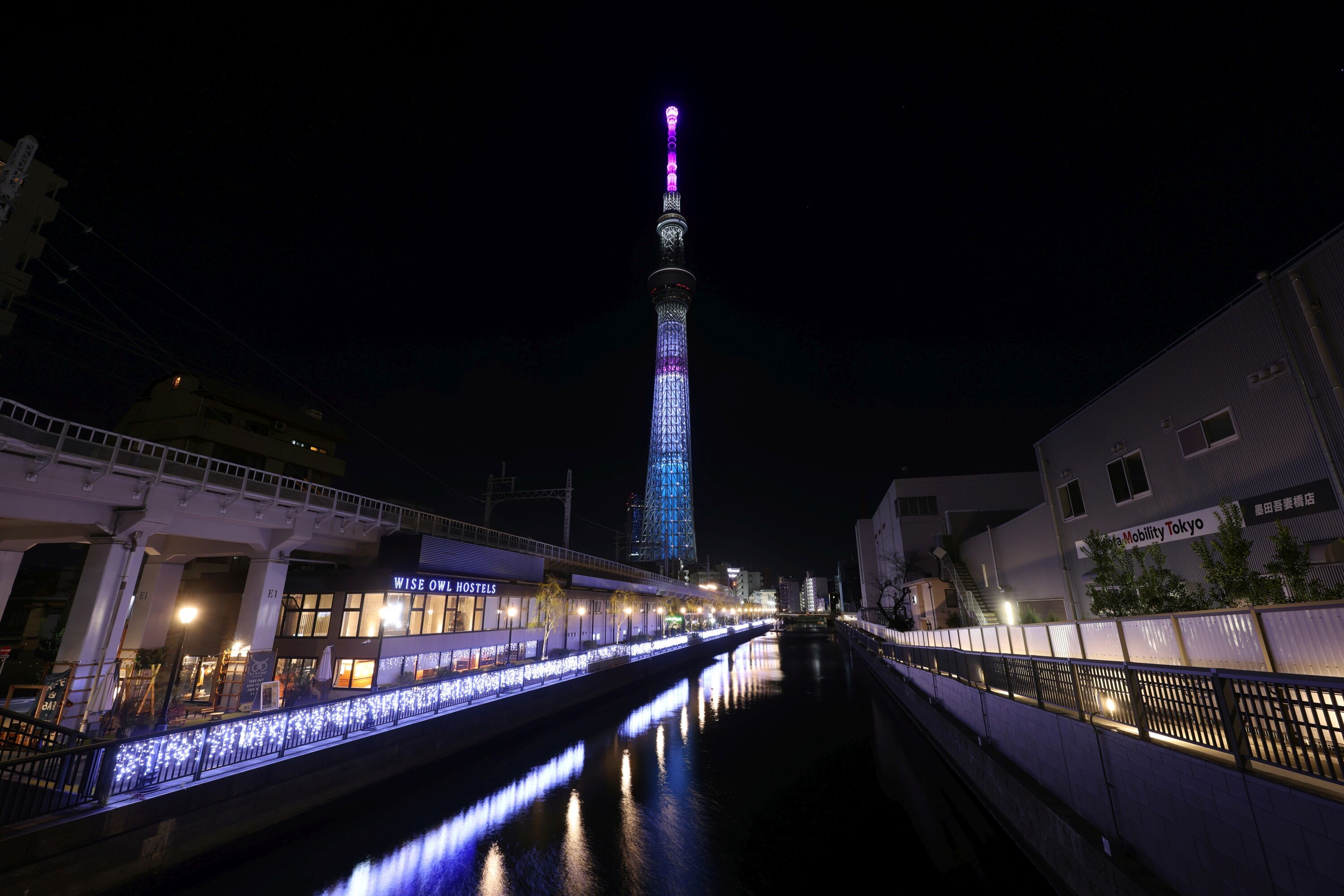 2024年2月24日に源森橋から撮影した東京スカイツリー夜景です。この日のライティングは『原神×TOKYO SKYTREE 青空の大冒険 ~雷霊に導かれて~ 』の開催を記念した特別ライティングで、原神のキャラクターたちをイメージした8種類のライティングが点灯しました。