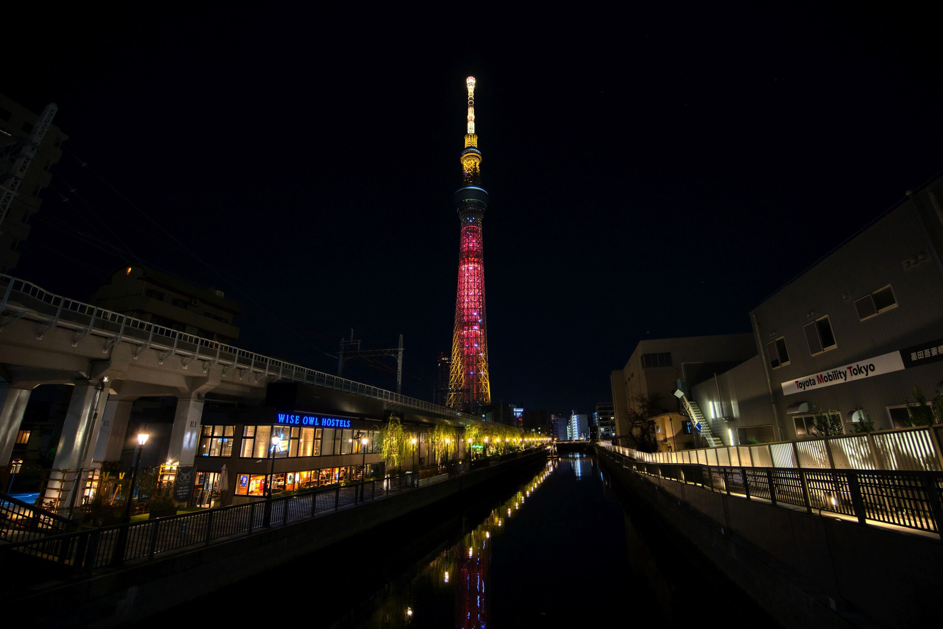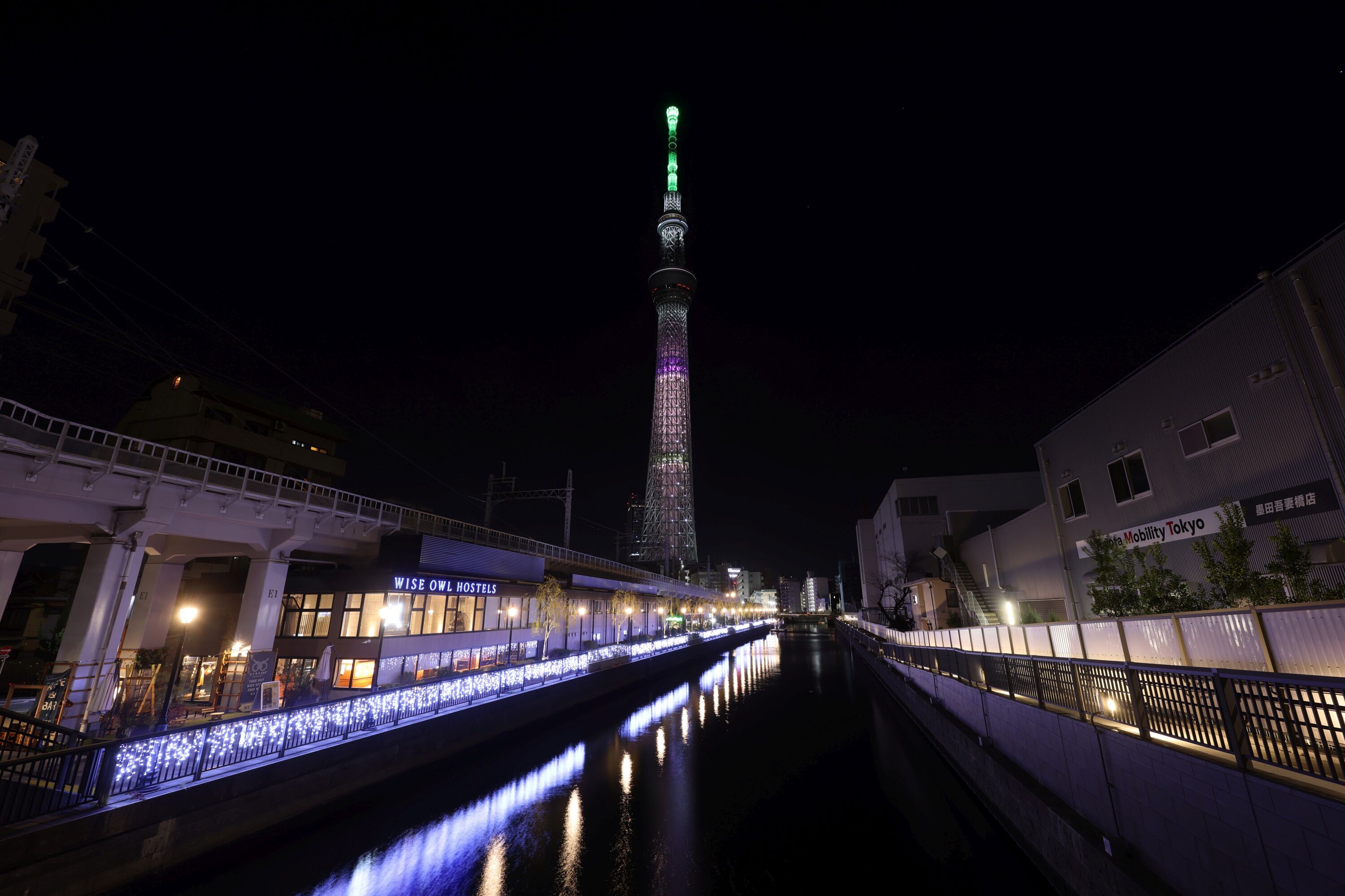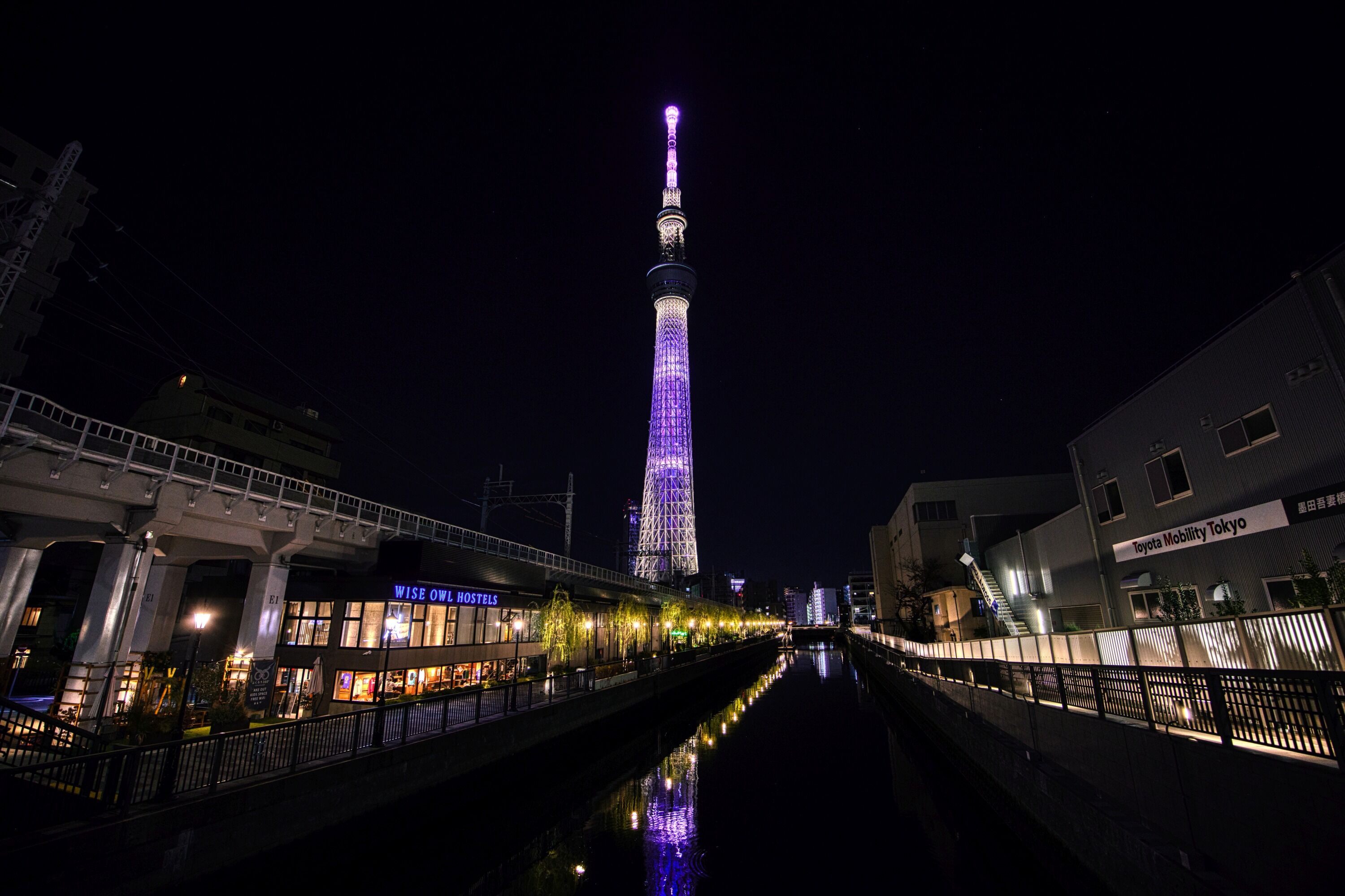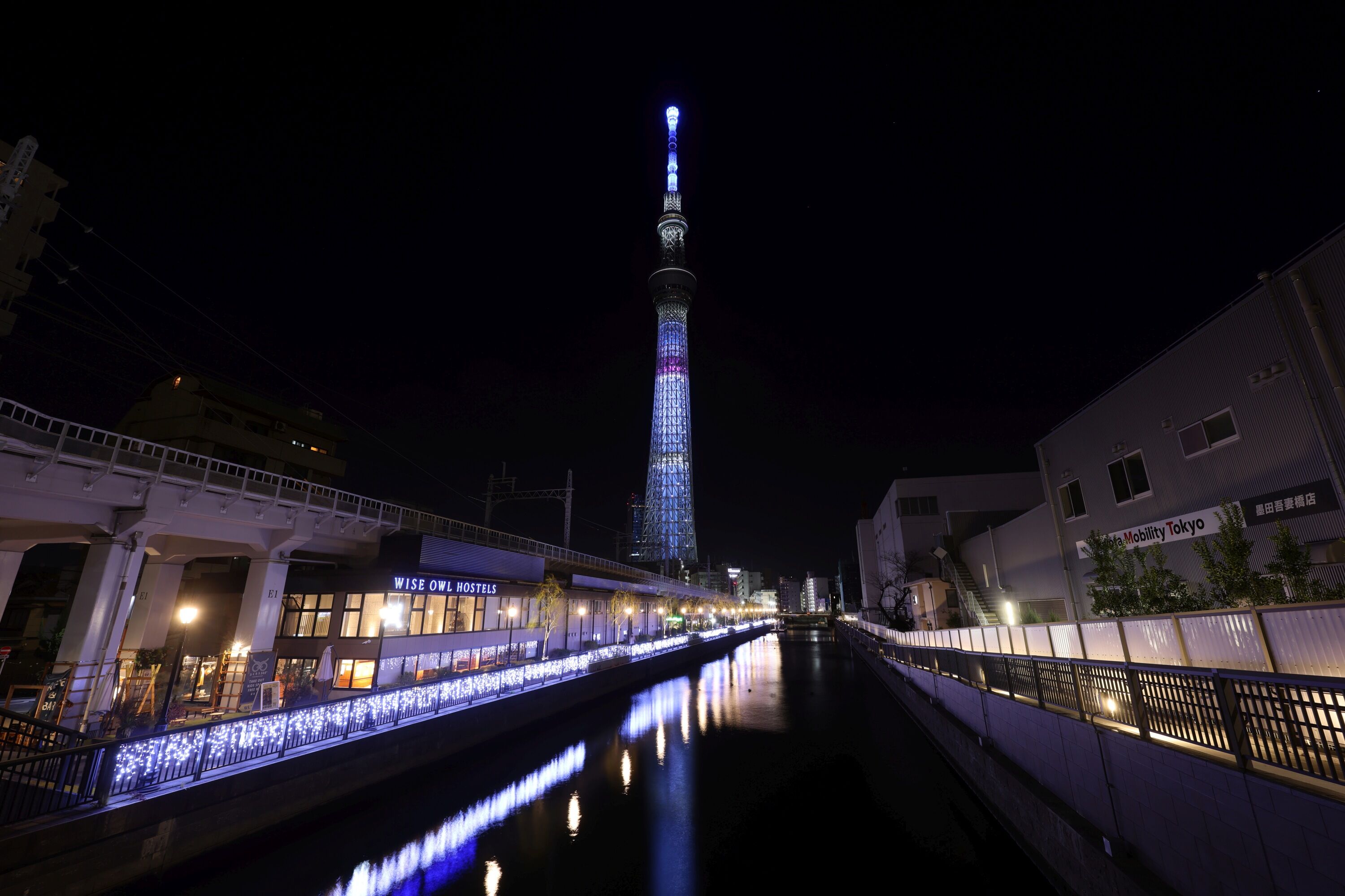 2024年2月24日に源森橋から撮影した東京スカイツリー夜景です。この日のライティングは『原神×TOKYO SKYTREE 青空の大冒険 ~雷霊に導かれて~ 』の開催を記念した特別ライティングで、原神のキャラクターたちをイメージした8種類のライティングが点灯しました。