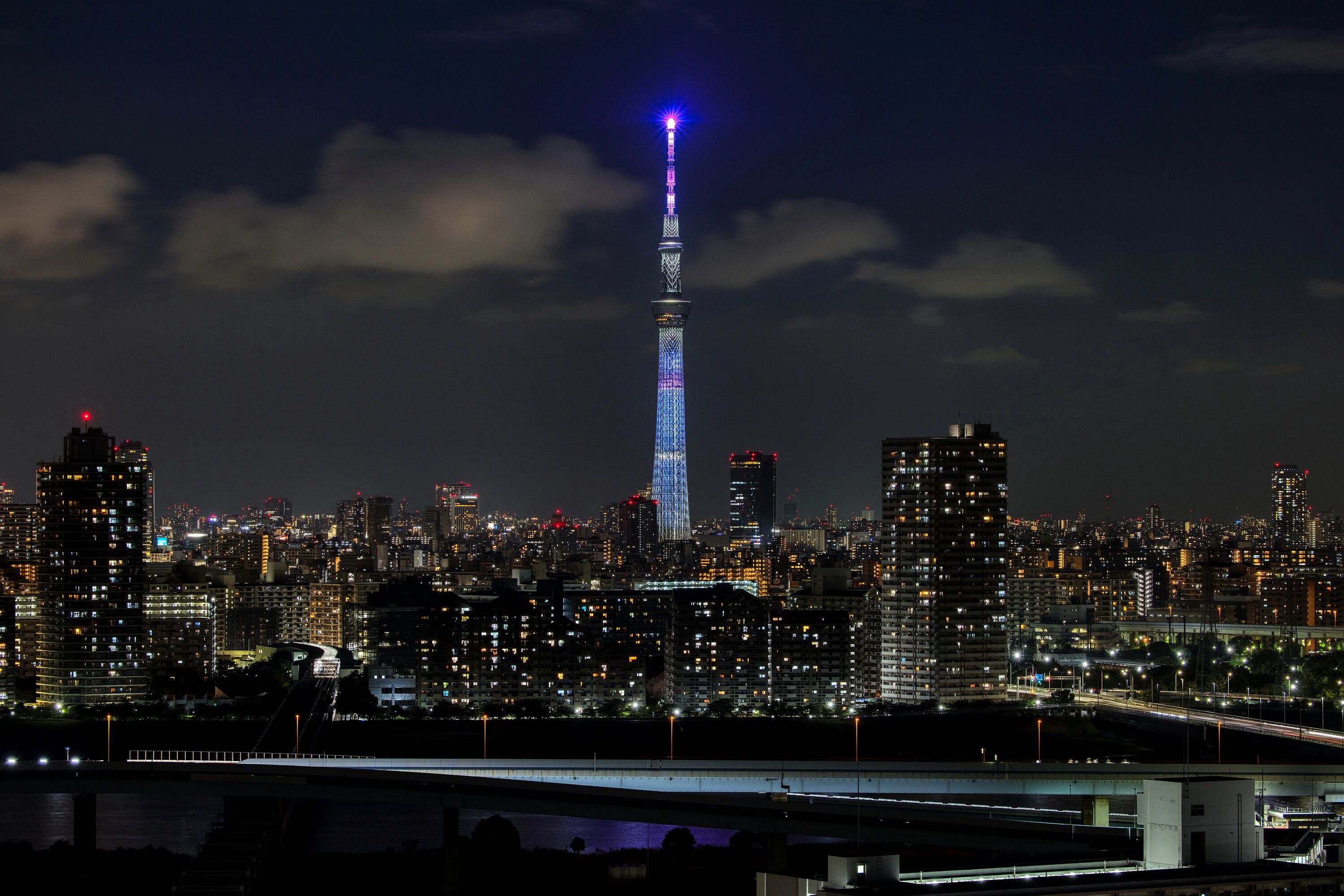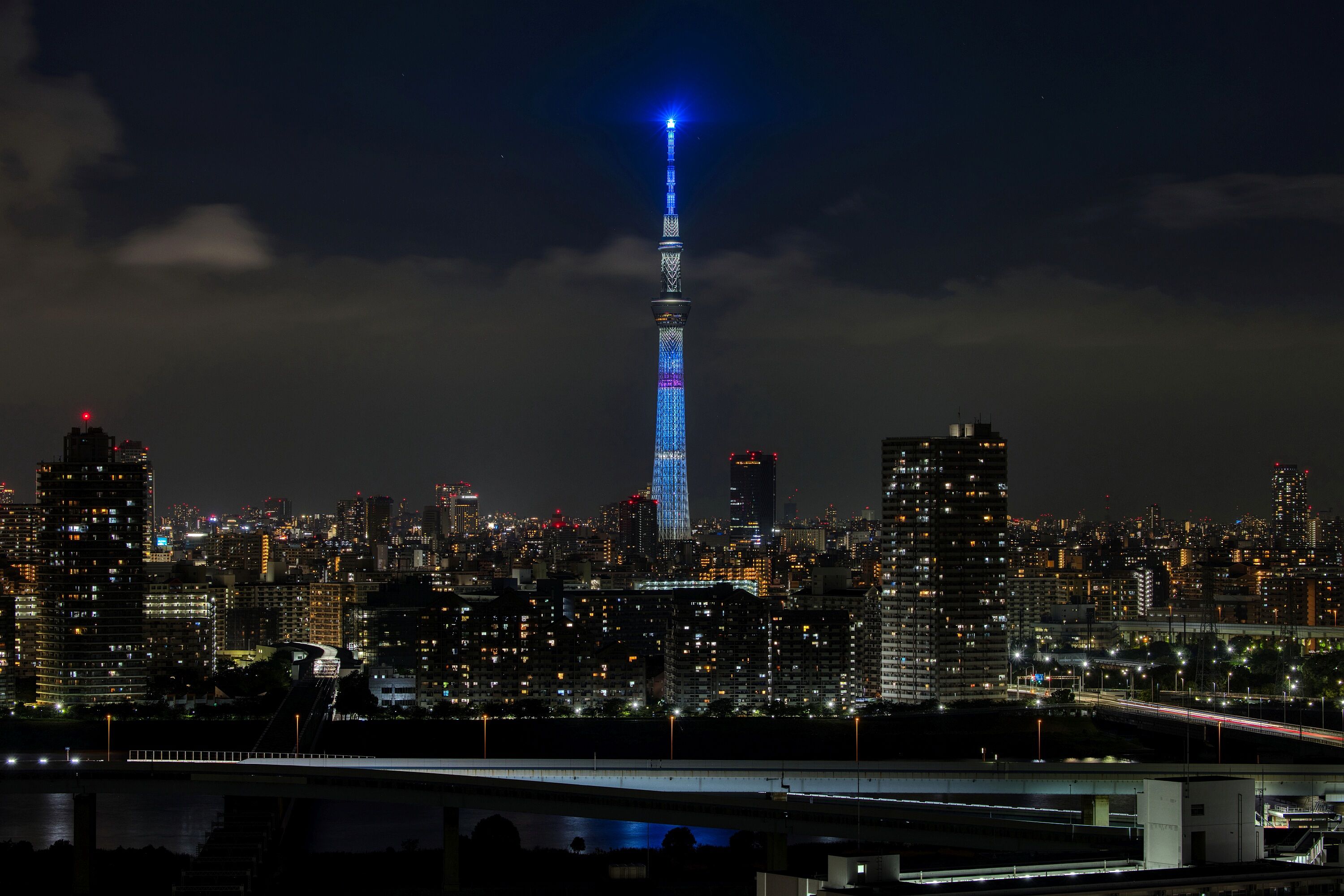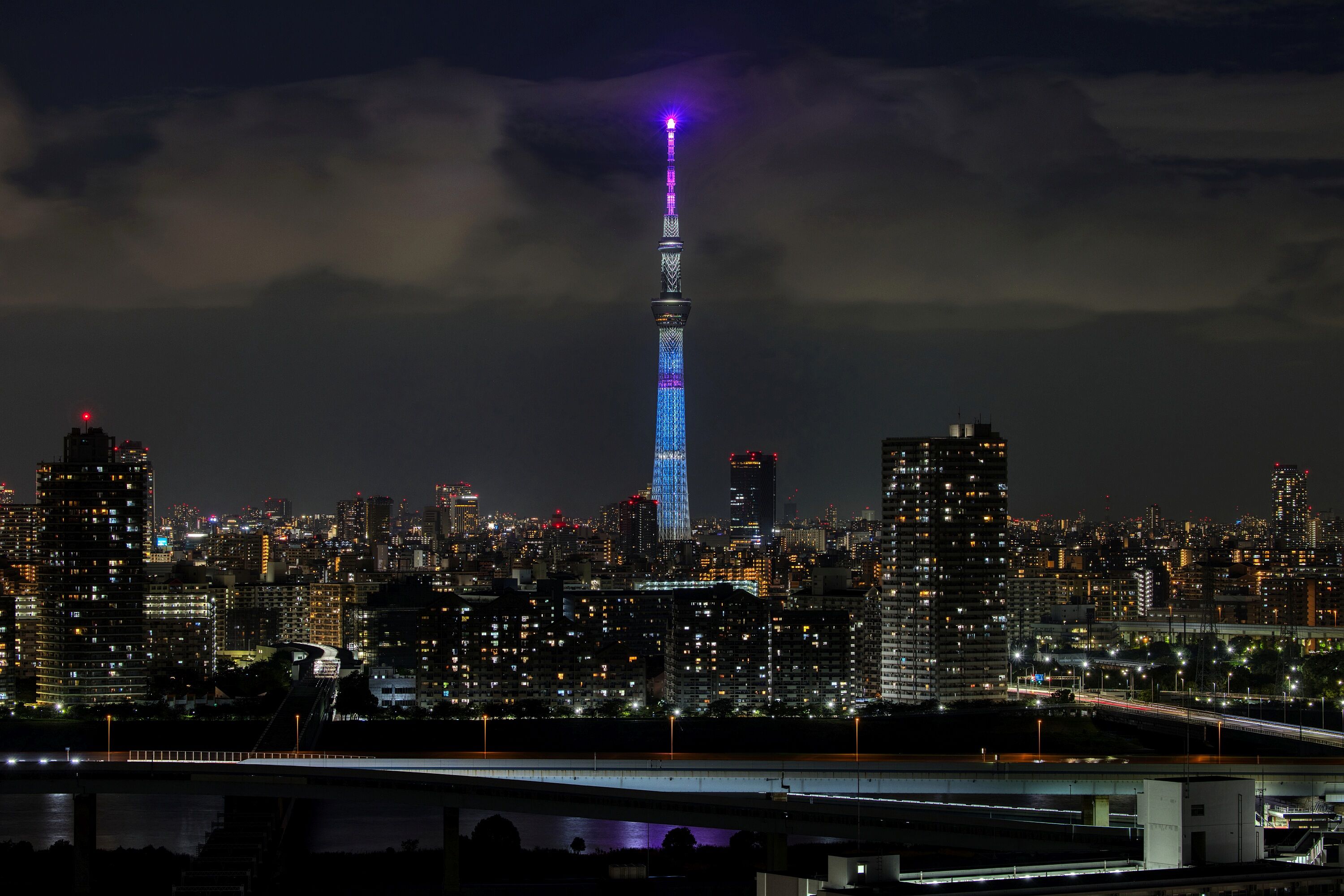 2025年8月4日、自宅マンションから撮影した東京スカイツリー夜景です。昨夜は試験点灯が行われました。ただ、昨日は視界が悪くてキレイに撮れない状態だったので、違うパターンがあるかもと思いながら2枚だけ撮って退散。試験点灯を撮った枚数、時間は過去最低です(^^;)