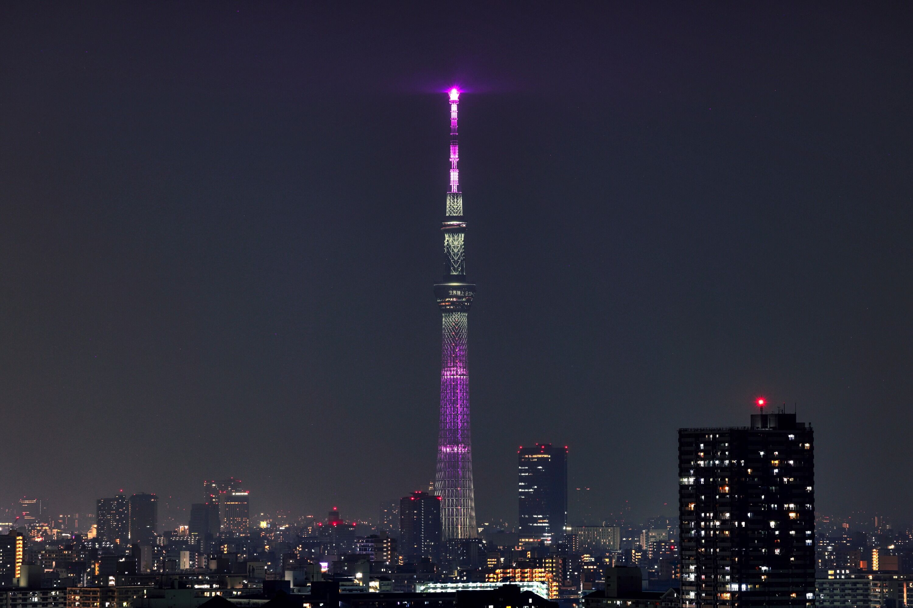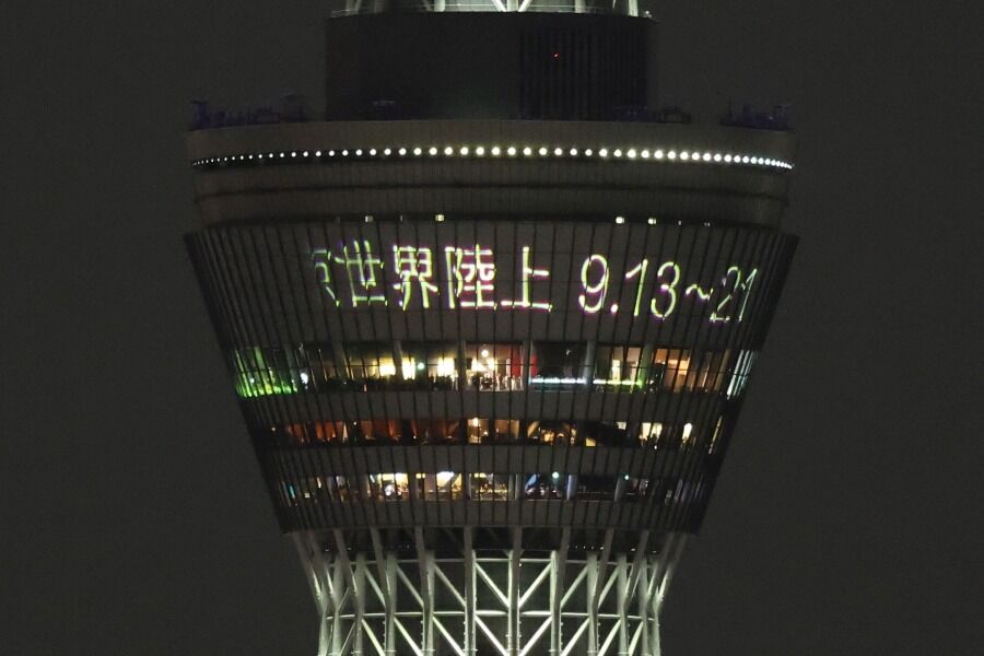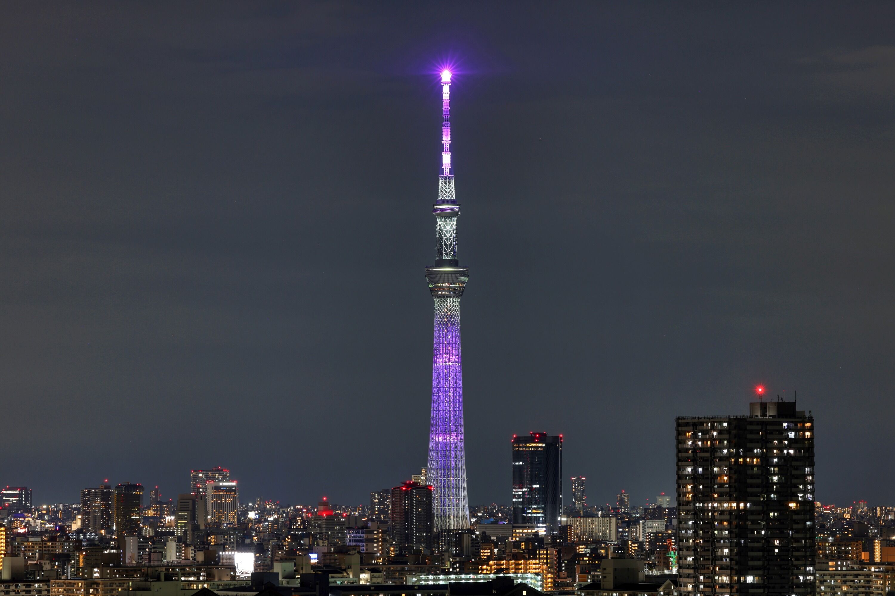 あとから撮った写真を確認すると天望デッキに「世界陸上」の文字がありました。前回点灯した世界陸上開催100日前の特別ライティングを見ると、大会のメインカラーである「江戸紫」を基調とした特別ライティングということで、今回はそれと同じライティングの微調整かと思います。