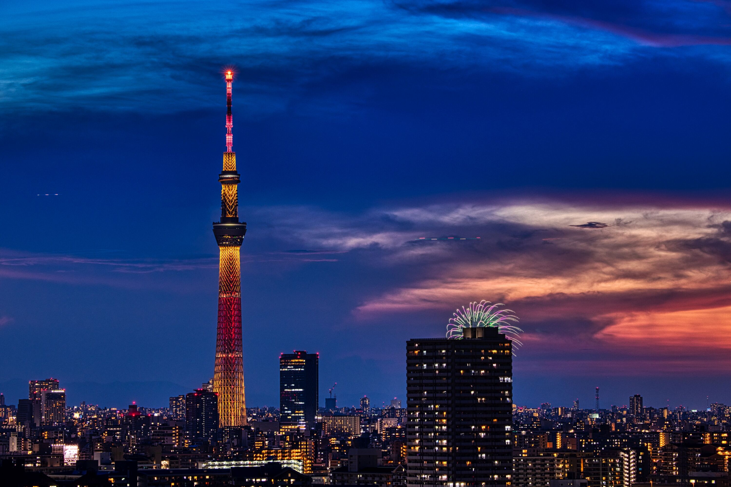 2025年7月26日、自宅マンションから撮影した東京スカイツリーと隅田川花火大会です。隅田川花火大会はまだ明るい19時からスタート。そのため最初は夕焼けと一緒に撮ることができます。