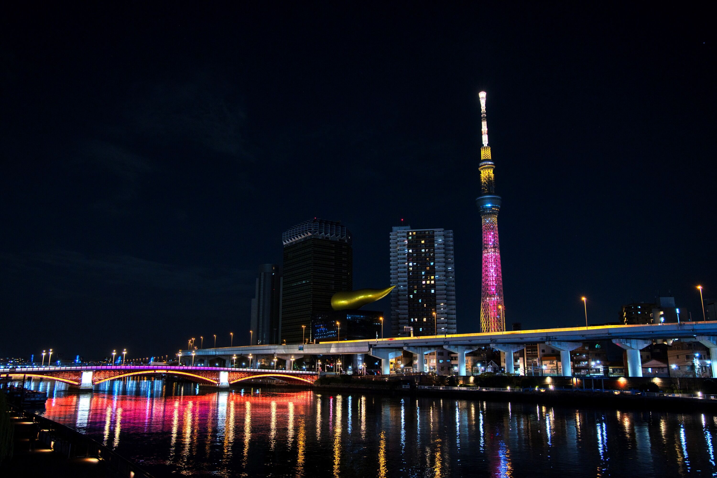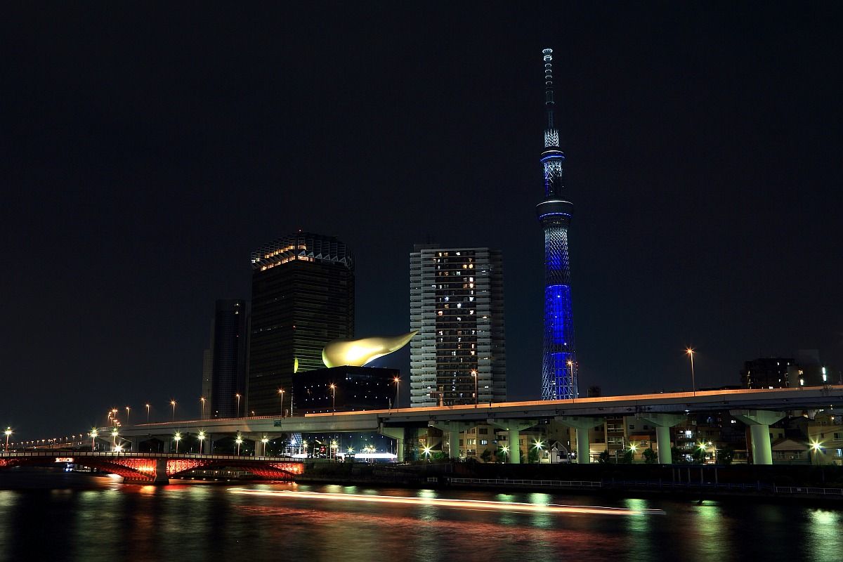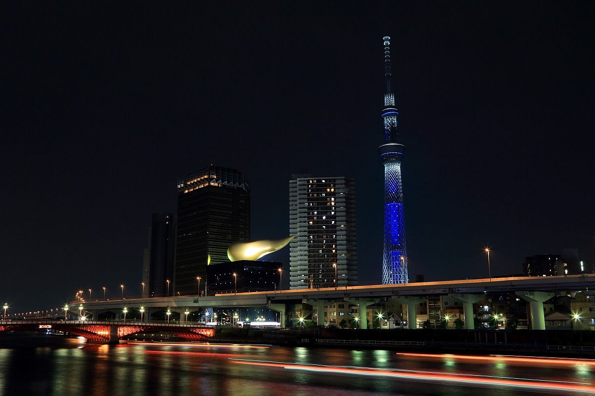 「SEVENTEEN」のツアータイトル「BE THE SUN」をテーマにしたオレンジから「SEVENTEEN」の公式カラーRose Quartz & Serenityに変化する演出となっており、これはオレンジ色のときの様子です。吾妻橋のライトアップとマッチしています。