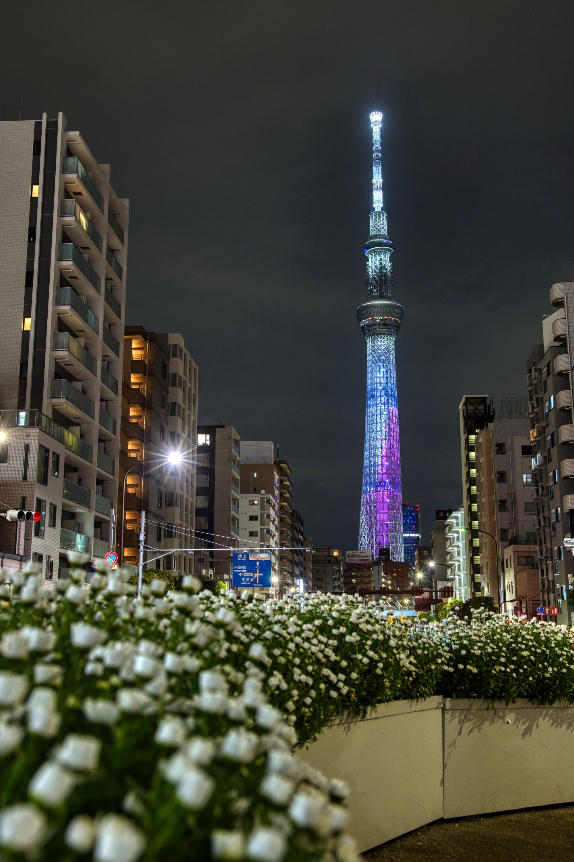 2023年12月31日に駒形橋前フラワーコーナーから撮影した深夜の東京スカイツリー夜景です。この日は誕生石ライティングの終了日で、12月の誕生石ライティング「タンザナイト(ライトープル)」が点灯していました。ここではいつも車の光跡が残るように撮っていますが、今回は深夜ということで車がいないタイミングで撮りました。