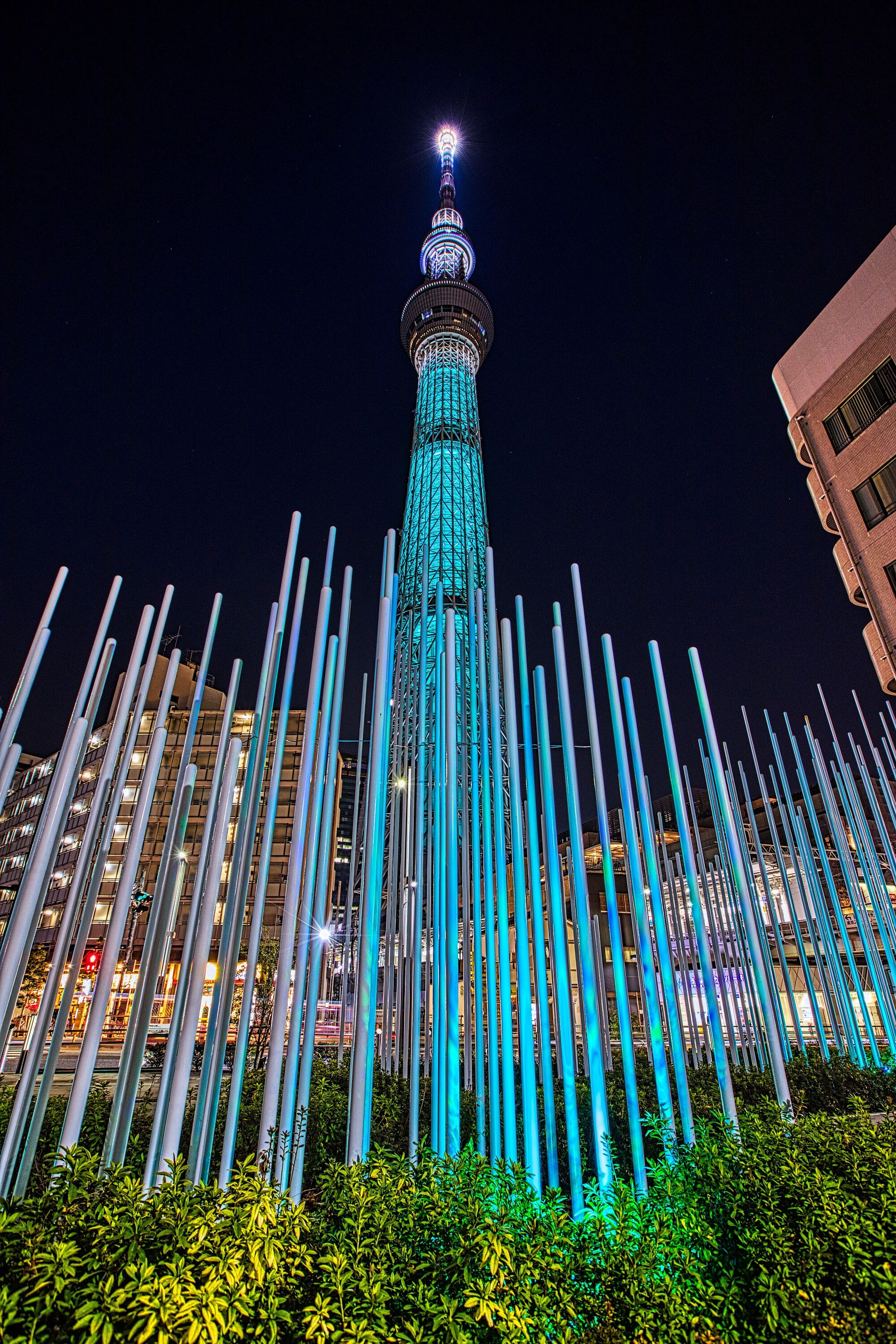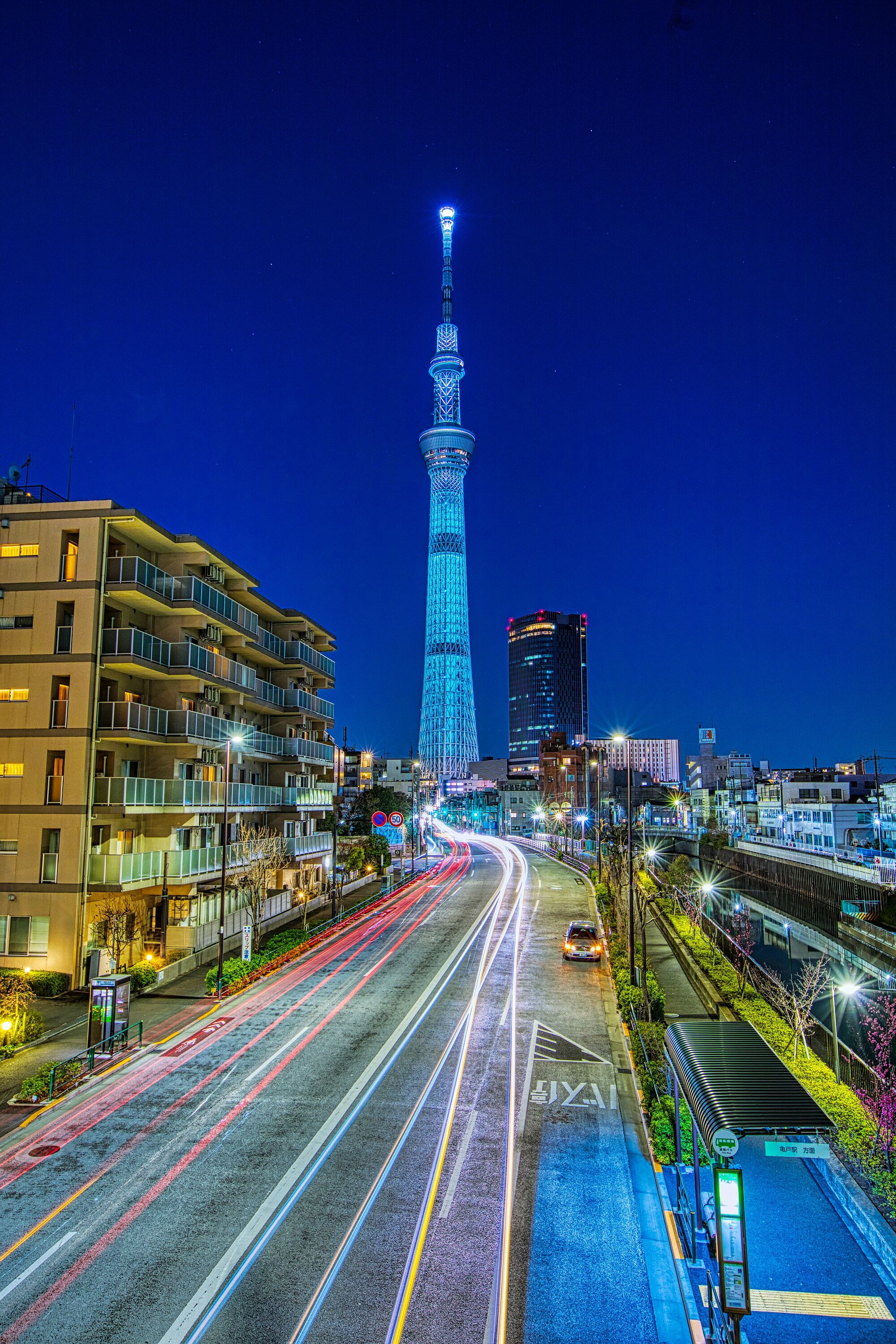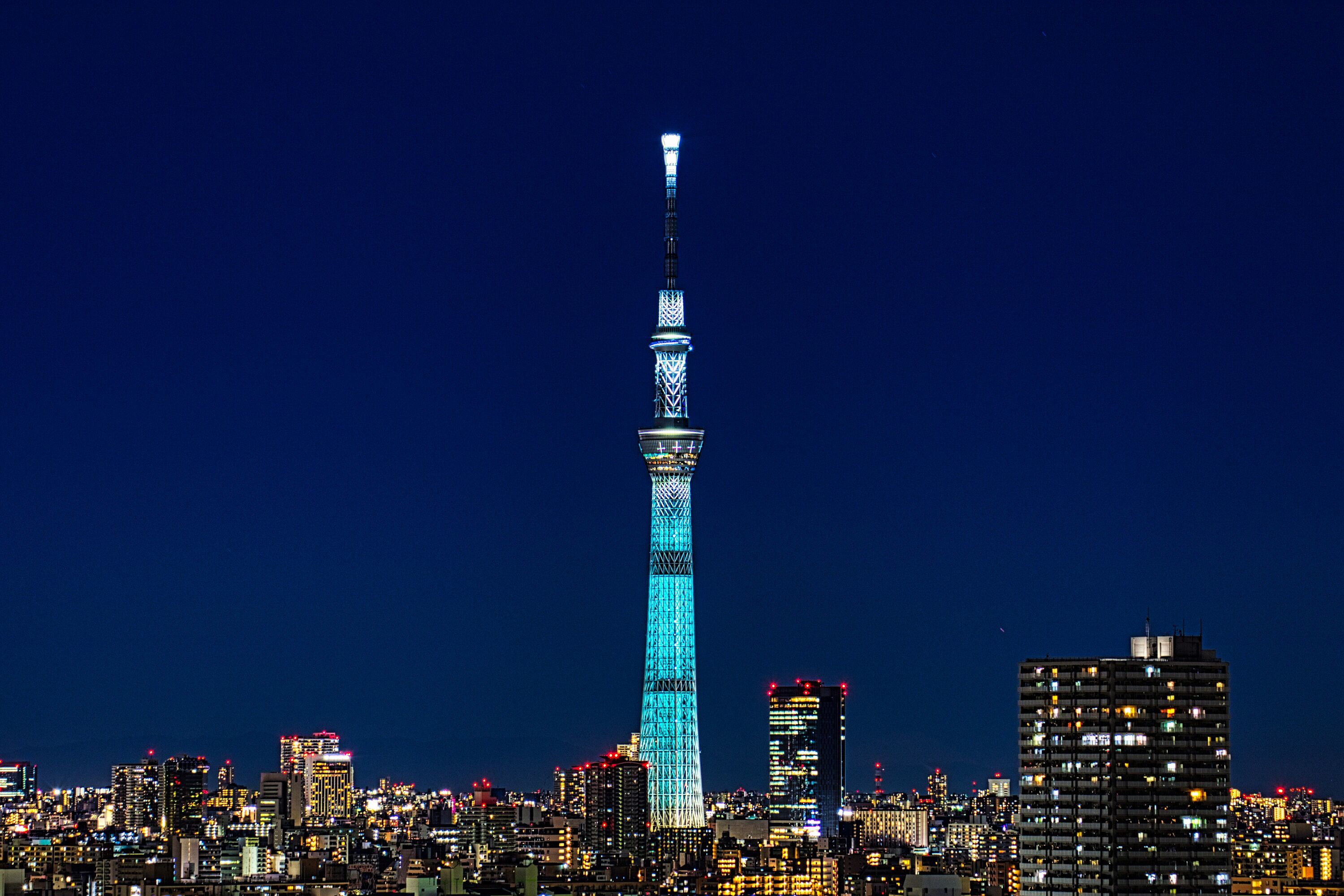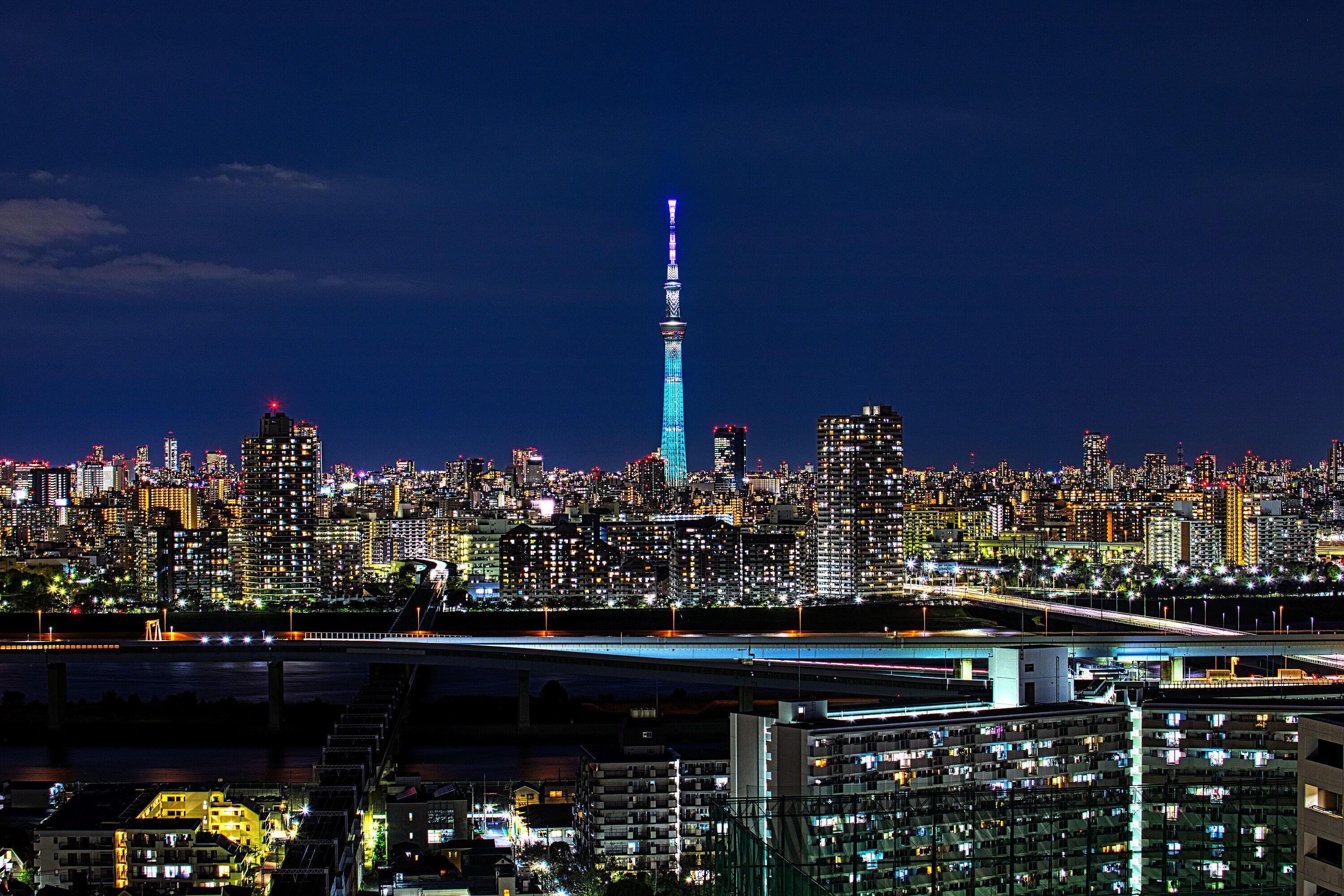 2022年8月25日、自宅マンションから撮影した東京スカイツリー夜景です。昨夜は東京スカイツリー開業10周年記念 特別ライティング リバイバル点灯として、2020年に点灯したアニメ『FINAL FANTASY Ⅶ』の世界における「魔晄の色」をイメージした特別ライティングが再点灯しました。