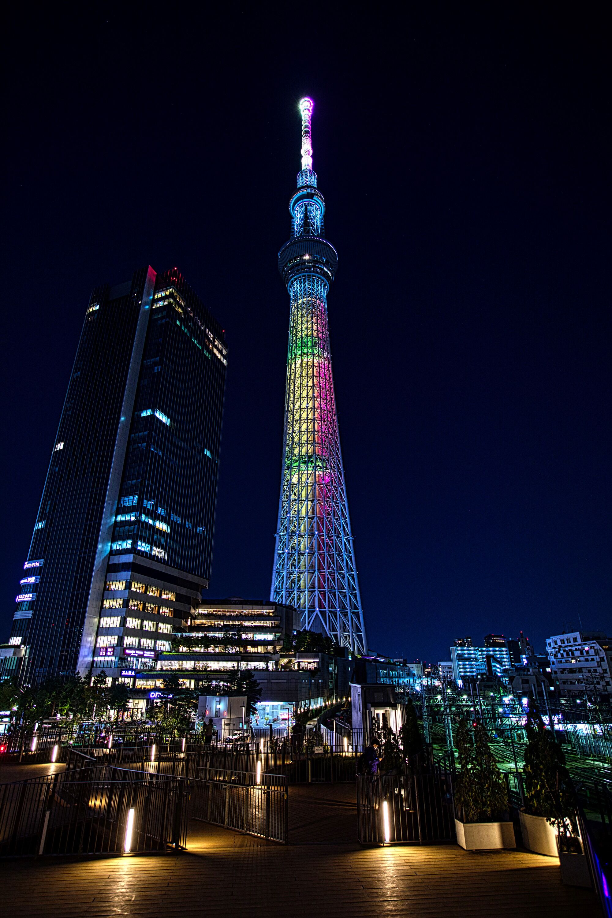 2020年10月26日、隅田川越しに撮影した17色に変化する特別ライティングです。これは2020年に創設75周年を迎えた国際連合に協力し、持続可能な開発推進(SDGs)の機運を高めることを目的として、SDGsの17色をイメージした特別ライティングとのことです。