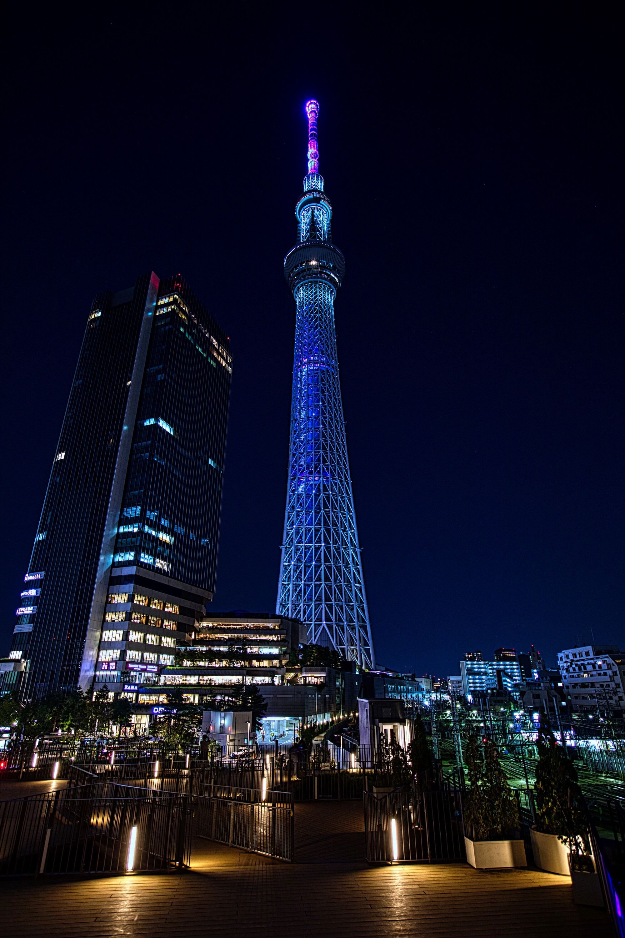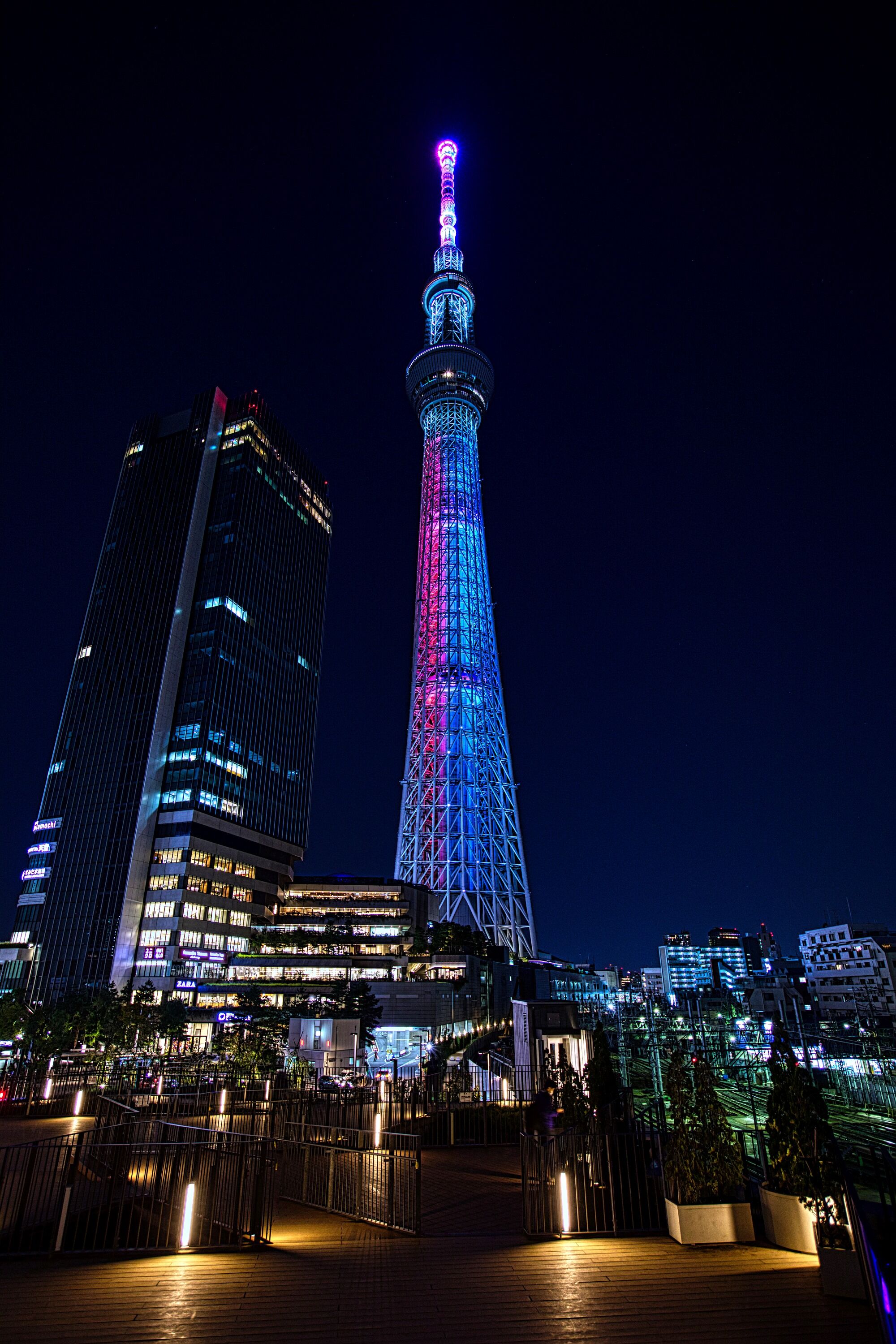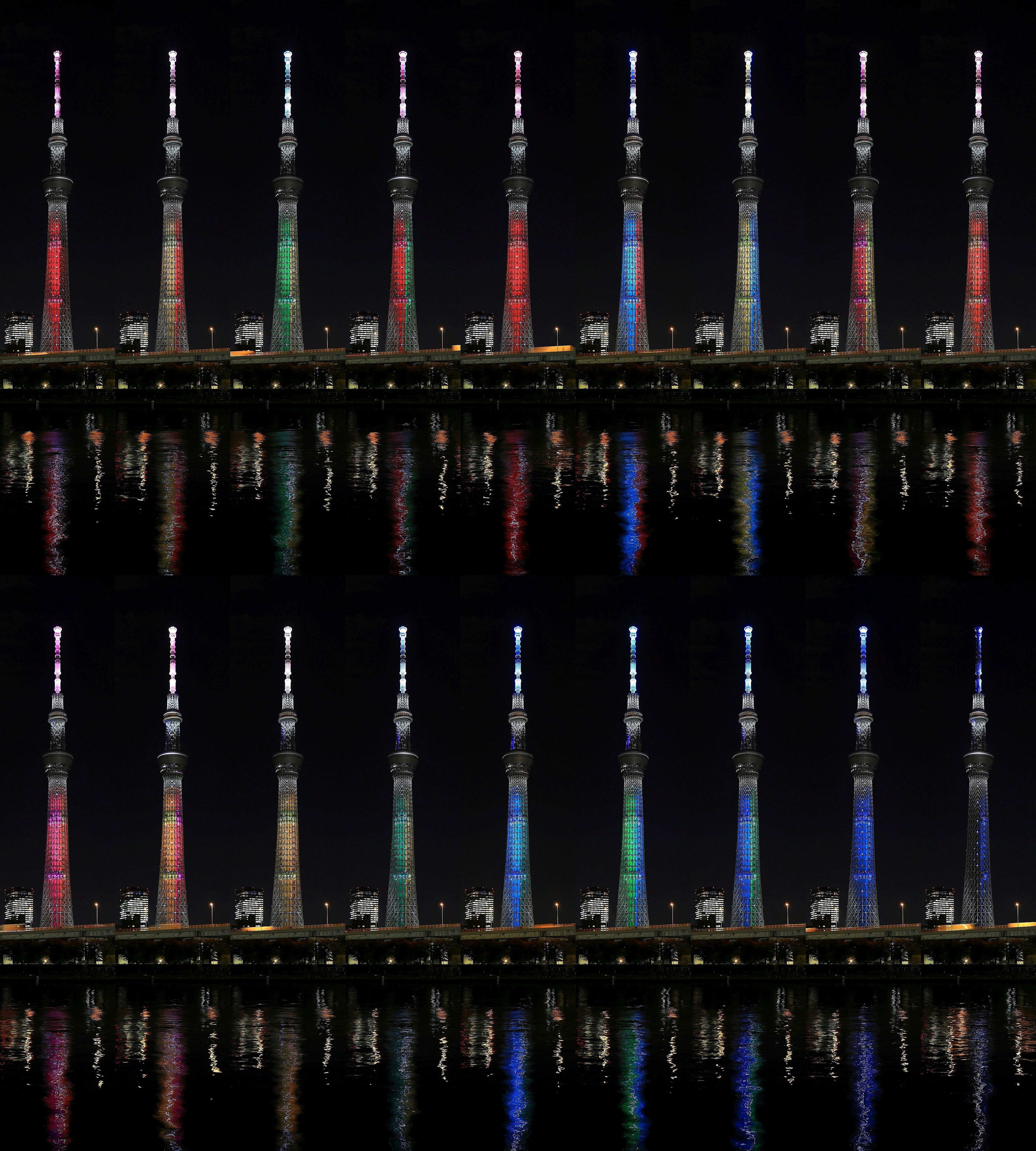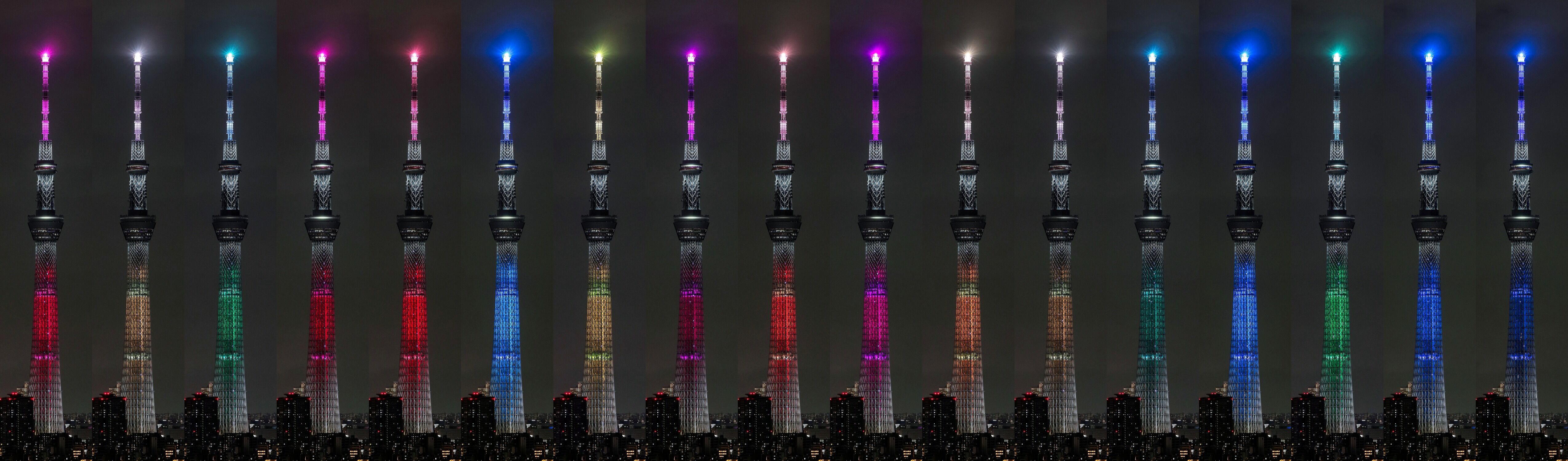 2020年10月25日、イーストタワーから撮影した17色に変化する東京スカイツリーの特別ライティングです。2020年に創設75周年を迎えた国際連合に協力し、持続可能な開発推進(SDGs)の機運を高めることを目的として、SDGsの17色をイメージした特別ライティングとなっています。