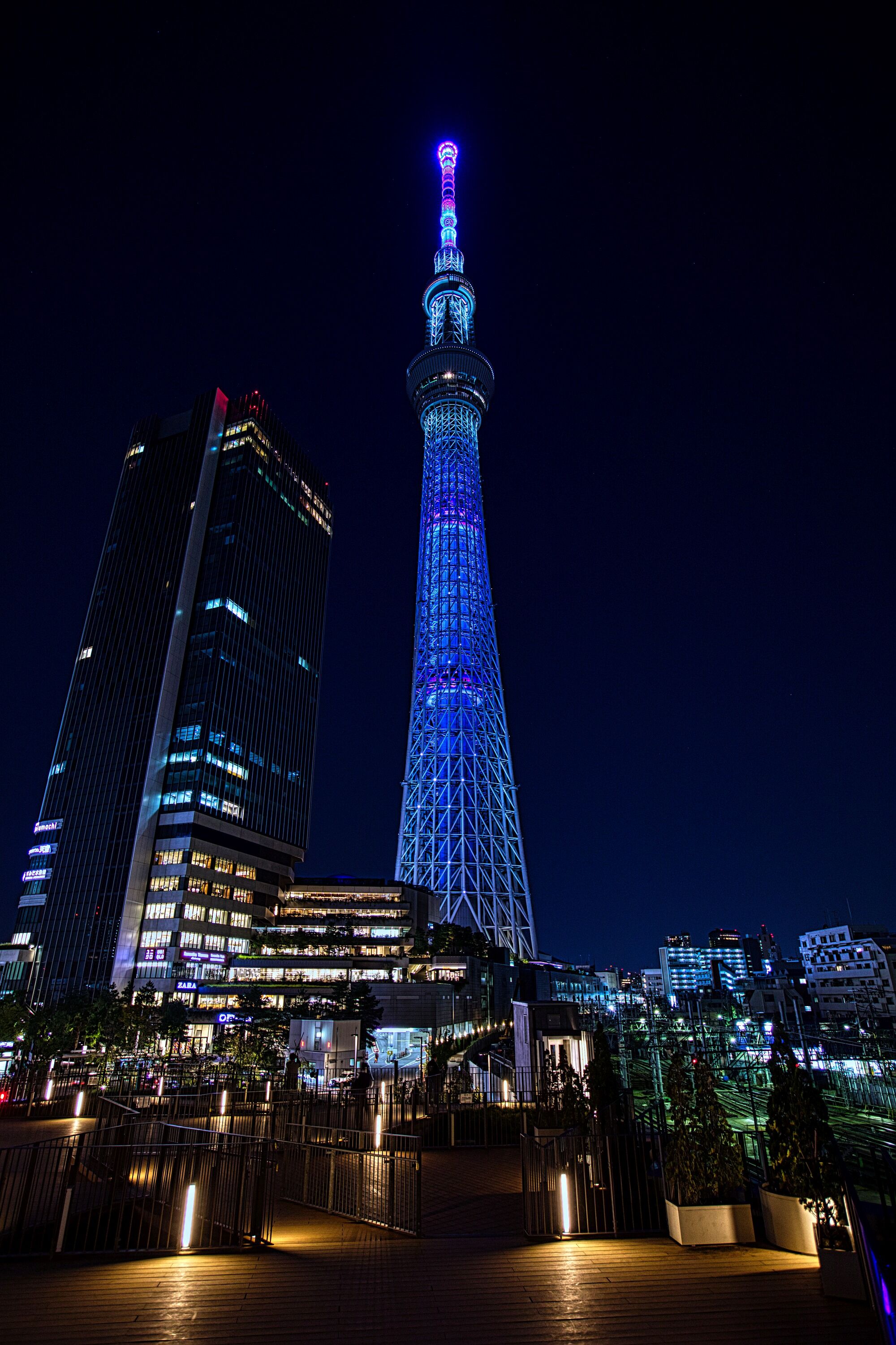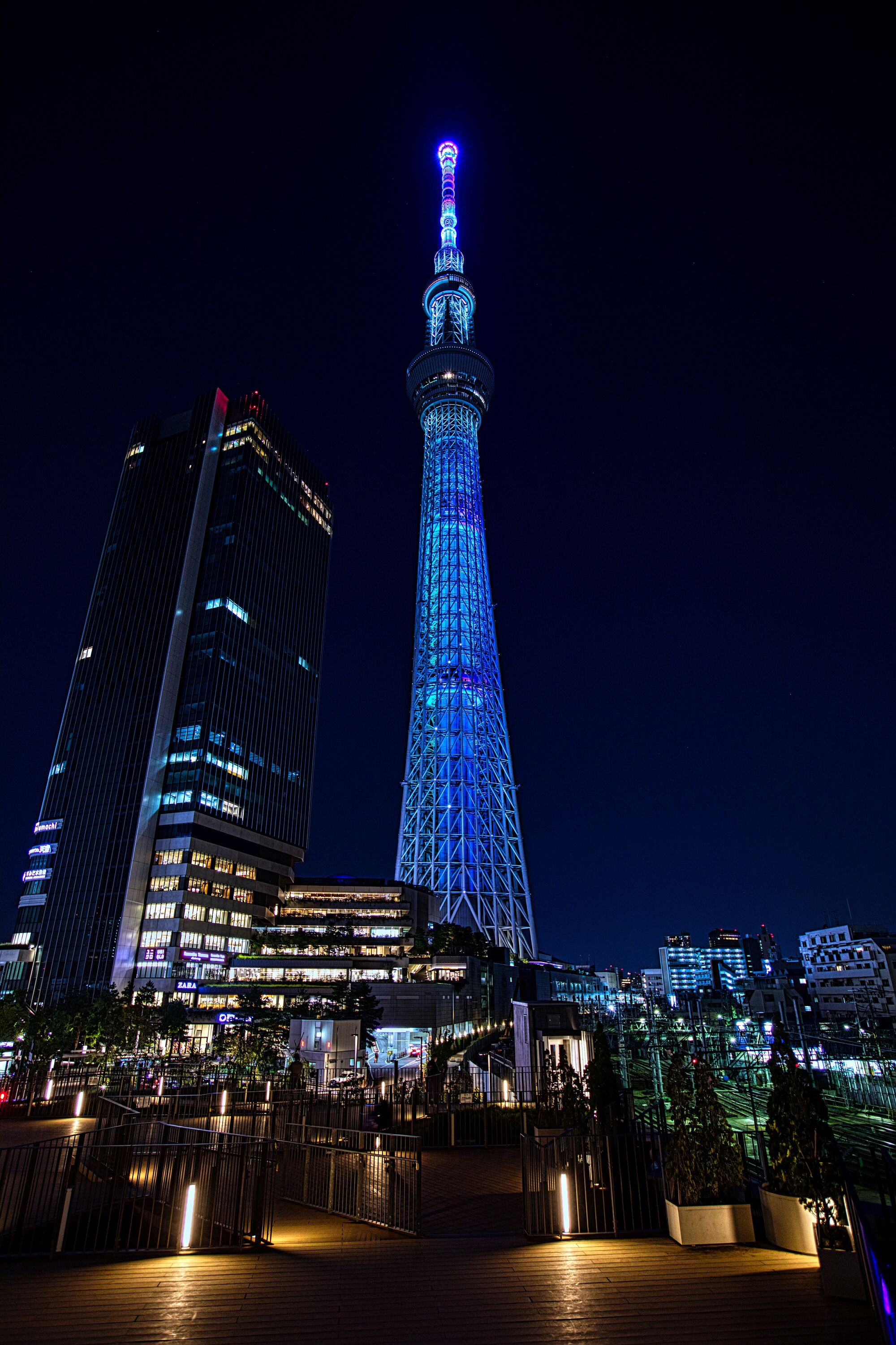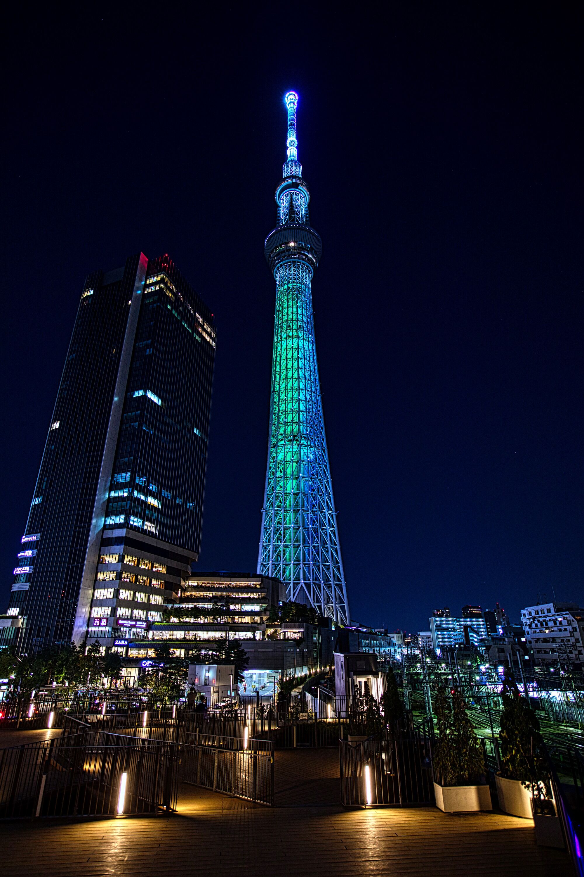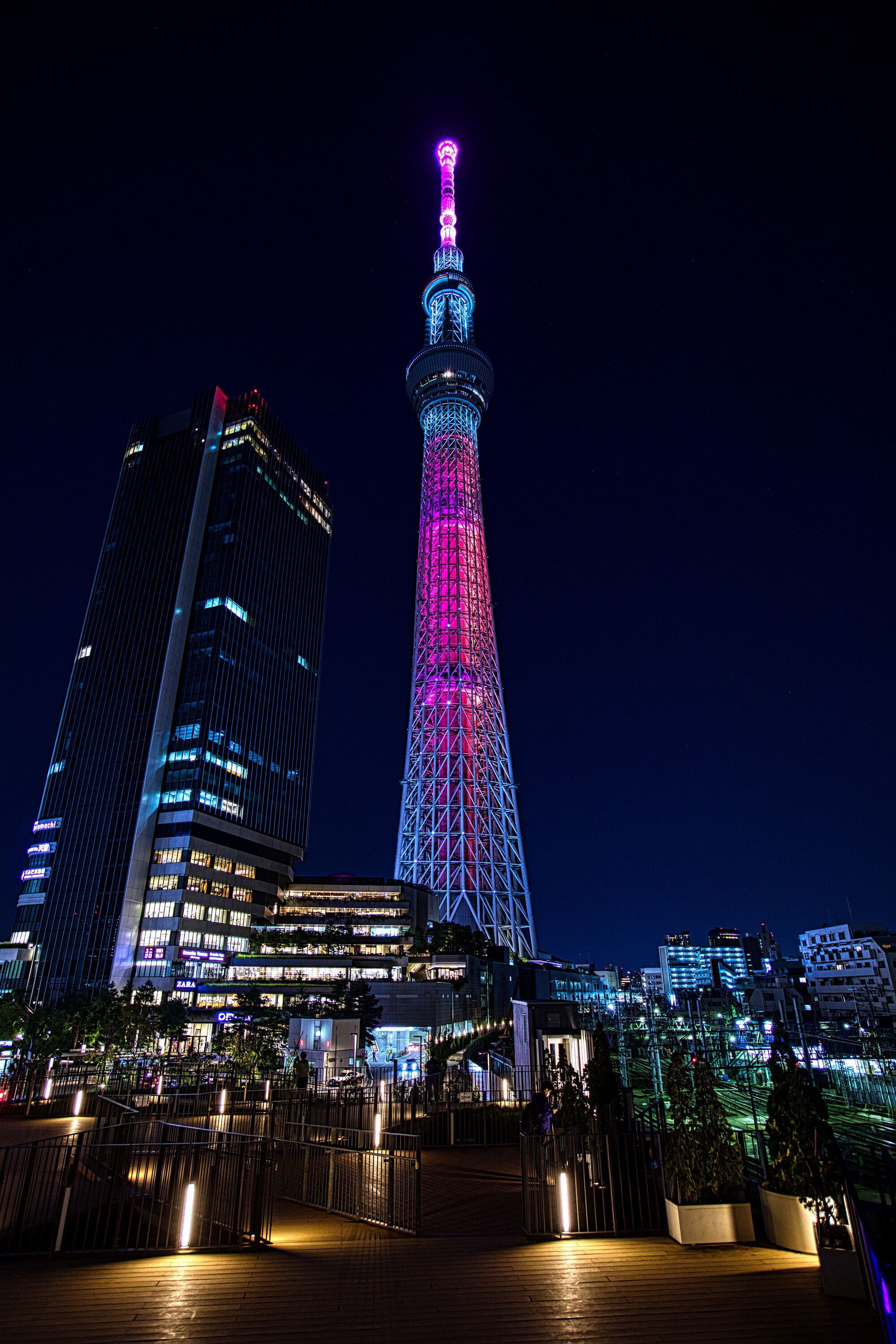 2020年10月25日、イーストタワーから撮影した17色に変化する東京スカイツリーの特別ライティングです。2020年に創設75周年を迎えた国際連合に協力し、持続可能な開発推進(SDGs)の機運を高めることを目的として、SDGsの17色をイメージした特別ライティングとなっています。
