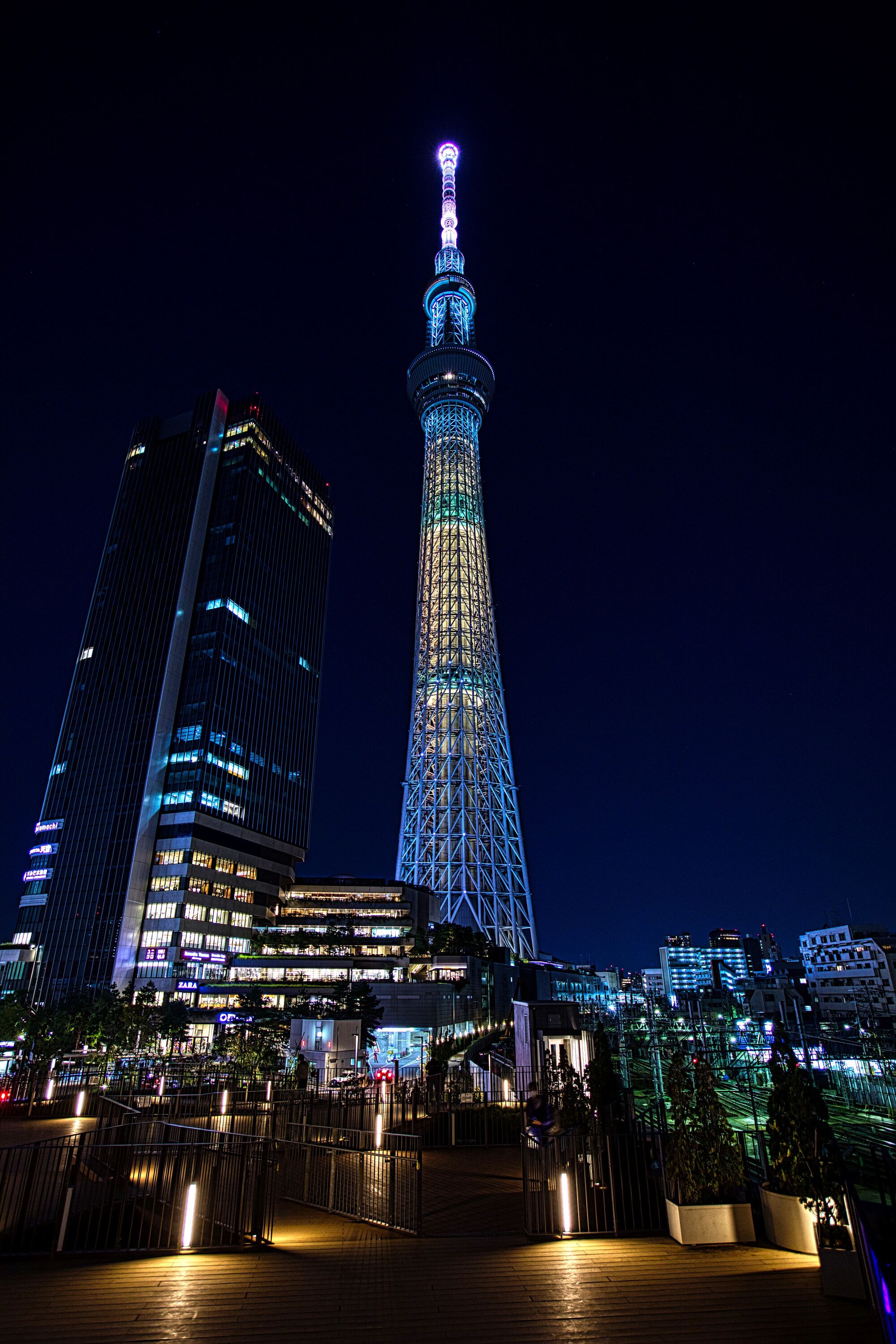 2020年10月25日、押上駅前自転車駐車場屋上広場から撮影した17色に変化する東京スカイツリーの特別ライティングです。毎回同じで説明ですが2020年に創設75周年を迎えた国際連合に協力し、持続可能な開発推進(SDGs)の機運を高めることを目的としてSDGsの17色をイメージした特別ライティングとなっていました。